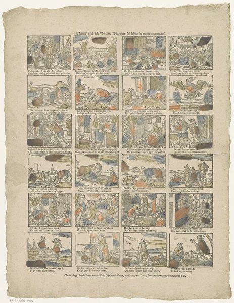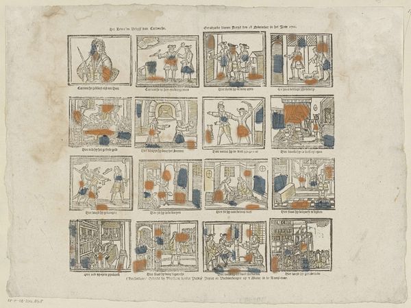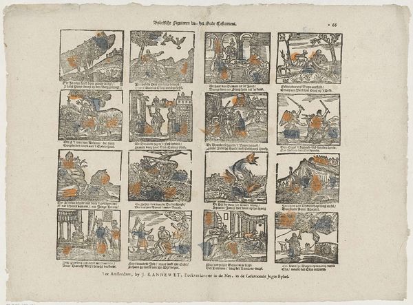 Curator: Immediately striking is the compositional layout—a series of miniature narratives presented in grid form, unified yet individually captivating. Editor: Here we have "Levendigen af-beeldzels van verscheyde bybelsche historien," a print attributed to Johannes (II) Kannewet, created sometime between 1725 and 1780. It's currently part of the Rijksmuseum's collection. Looking closely, it seems to be an engraving, possibly enhanced with some later hand-coloring. Curator: The use of line is particularly noteworthy, isn't it? Each small image employs hatching and cross-hatching to generate depth and shadow, while simultaneously flattening the representational space. Editor: Agreed, although to me it reveals much about printmaking workshops. These miniature scenes, presumably depictions from Biblical stories as the title suggests, seem almost mass-produced. I wonder about the division of labor and how many artisans were involved in churning out prints like this. Curator: I think the semiotic interplay is more important than the context. Each frame functions as a signifier, a condensed allegory inviting viewers to decode deeper spiritual meanings through close, almost meditative contemplation. Note how each segment functions as a world unto itself with distinct iconographic codes that signal their narratives. Editor: But surely the purpose and means of dissemination affected that interpretation! Prints such as these are quite democratic by allowing a broader section of society to access imagery and narratives typically confined to elites through larger history paintings. Its scale and mode of production would inform its reception, altering that meditative aspect that you mentioned. Curator: You know, perhaps, that intersection between material accessibility and semiotic richness creates its distinctive Baroque tension. Its cheap mode of making makes grand historical narratives more available to those from the common masses who may learn something from a symbolic religious parable. Editor: Indeed, recognizing the material circumstances enriches our appreciation. It gives the work meaning not only as a product of skilled labor but as a cultural artifact shaped by its means of distribution, audience and purpose. It truly embodies the spirit of its age, and yet is so particular to it. Curator: In that sense, tracing this single piece does unravel different facets of artistic, religious, and societal values during that period. Editor: Precisely—a tangible and valuable lens through which to study cultural production, the lives of makers, and consumer culture!