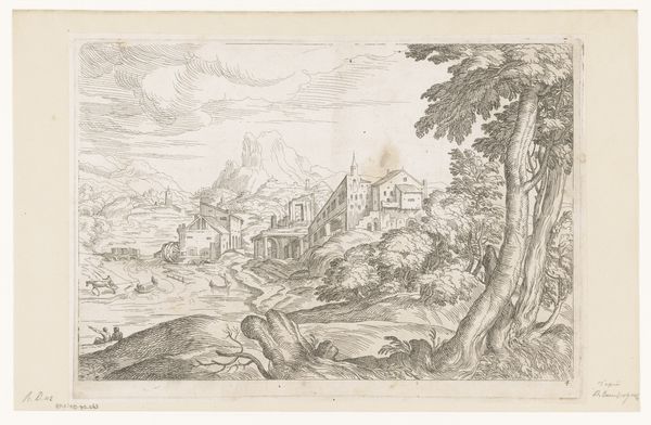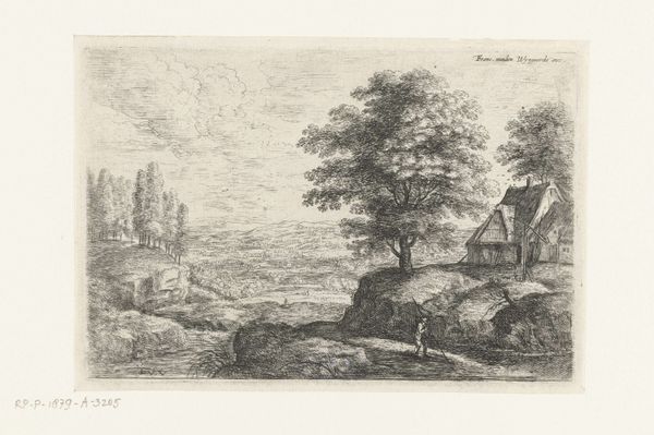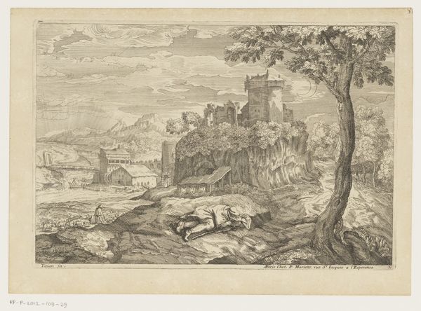 This print, "Landschap met spinnende herderin," or "Landscape with a Spinning Shepherdess," was made by an anonymous artist in the Netherlands, though we don't know exactly when. At first glance, it seems like a simple pastoral scene. But let's consider its context. The presence of both rural tranquility and a fortified town hints at the social and political tensions of the time. The Netherlands in this era was a place of burgeoning trade and relative peace, but it was also a place of great political and religious conflict. The inclusion of armed horsemen suggests the constant threat of violence. By combining seemingly disparate elements, this artist comments on the complex relationship between the idealised countryside and the looming reality of social unrest. To understand this work more fully, we might consult historical records, political pamphlets, or even popular songs of the period. Art is always made in a specific time and place, shaped by the social and institutional forces at play.