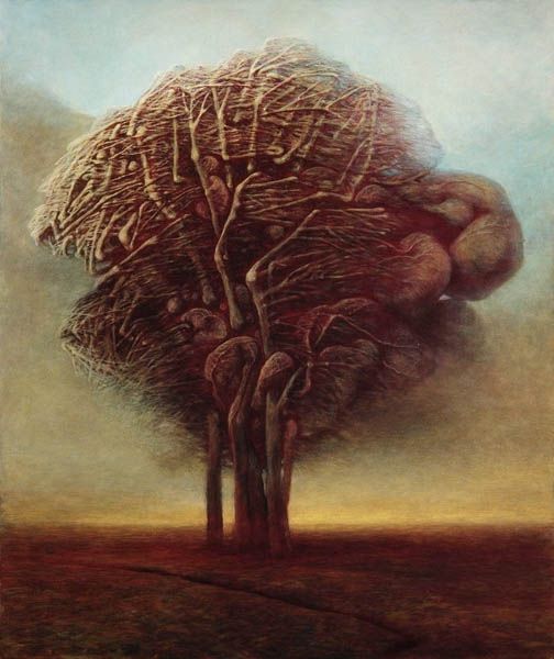 This is an untitled work by the Polish artist Zdzislaw Beksinski. We don't have the date of execution, but it is likely this painting was made sometime in the late 20th century. Beksinski lived through both Nazi occupation and Soviet communism in Poland, shaping his worldview and artistic output. This work shows an unsettling skeletal tree-like form emerging from the landscape, rendered in muted browns and oranges, with a barely visible horizon line. His work often depicts apocalyptic scenes and nightmarish visions. We see a society in decay in the face of political and social pressure. Beksinski refused to interpret his own work, leaving it up to the viewer, and rejected modern art. His approach was deliberately at odds with established artistic institutions. Researching the political climate and cultural history of Soviet-era Poland can bring us closer to understanding Beksinski's vision.