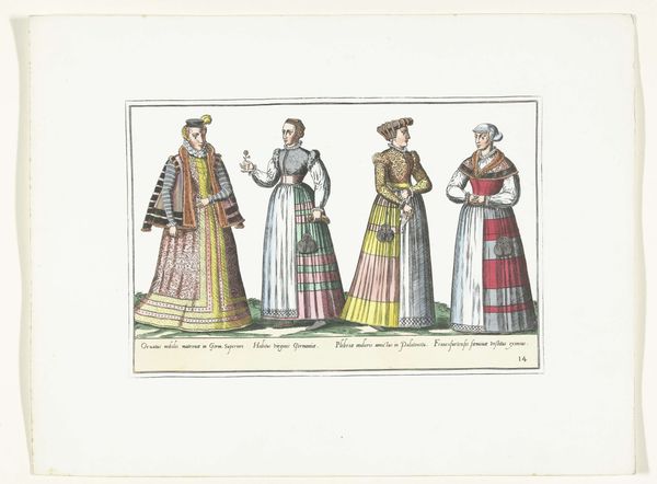 Editor: Here we have "Four Women Dressed According to German Fashion in Frankfurt, ca. 1580," a print from around 1872-1875, currently held at the Rijksmuseum. The clothing is incredibly detailed and seems to indicate a clear social hierarchy. What stories do you think this work is trying to tell us? Curator: This print, though created centuries later, provides us with a fascinating glimpse into 16th-century Frankfurt, Germany. But it’s not simply a neutral record. We must consider whose gaze is prioritized here. How does the artist represent these women, and what does that representation tell us about societal expectations and power dynamics? Editor: So, beyond just illustrating historical fashion, it's also commenting on those expectations? Curator: Precisely. Look at their poses, their garments. The layers upon layers might suggest wealth and status, but might it also be seen as a form of restriction, physically and socially? Think about the restrictions placed on women, and how this print can spark conversations about identity and agency. What do you notice about their facial expressions? Do you see confidence, or something else? Editor: They seem… reserved. I hadn’t thought about the layers as restriction before, but that’s a powerful reading. So the print then offers both historical insight, and prompts us to critically examine societal constraints? Curator: Exactly. Art serves as a dialogue between past and present, illuminating historical realities while urging us to critically assess contemporary injustices and power structures. Consider who had access to fashion and art during the 16th century, and what kind of social message this work is sending to modern audiences. What has this conversation sparked for you? Editor: It’s made me consider art as more than just visual representation but as a historical document ripe for interrogation through contemporary lenses. Curator: Precisely, and by critically examining art, we deepen our comprehension of society.