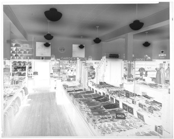 Curator: This is John Deusing's "Untitled (McLellan's store interior)", a photograph housed at the Harvard Art Museums, measuring approximately 8 by 10 inches. What strikes you first? Editor: The high contrast immediately casts a stark, almost ghostly mood. Look at the regimented rows of merchandise. One immediately thinks of the labor needed to produce and display all these items. Curator: Indeed, the geometric composition is quite deliberate. The receding lines of the counters, punctuated by those hat-like light fixtures, create a strong sense of depth and order. It's a study in perspective. Editor: And a study in consumerism! What materials are on display? It's hard to tell precisely, but one can imagine the variety and the global reach of their production. Curator: You're right. The photograph's strength lies in how it captures that tension between visual harmony and the underlying mechanics of commerce. The semiotic weight of the image invites reflection on our culture of consumption. Editor: It makes you consider the exploitation and environmental impact. Food for thought, indeed.