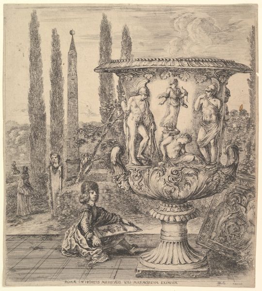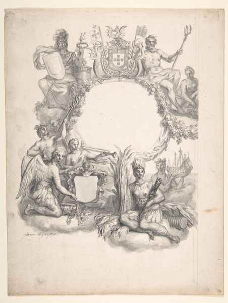 Editor: This is Luigi Valadier’s “Design for a Gold and Silver Bishop's Reliquary," created sometime between 1780 and 1800. It's a drawing that includes coloured pencil, print, and watercolor and you can find it at the Met in New York. It looks so…balanced, yet imposing. What jumps out at you? Curator: Balance, yes, absolutely! That Neoclassical obsession with order. But it's not just balance, is it? Look at the figures—they're burdened, aren’t they? Those supporting figures, almost buckling under the weight of the reliquary...it's heavy with significance, and literally so, it seems. It makes you wonder, doesn’t it? Are they supporting the church or being crushed by it? What do you feel? Editor: I didn't initially think of it that way, but now that you mention it, they do look strained! I was focusing more on the cherubs on top; I was almost going to say how 'sweet' they were, but that seems off now, somehow… Curator: Sweetness with a side of the symbolic! Neoclassicism often layered a veneer of classical 'prettiness' on complex ideas, you know? But look closer – the cherubs are, in a way, empowered, in control. It makes me wonder about the whole thing -- how power flows and is supported in religious structures of the time... and today, for that matter! It reminds us, perhaps, of how such power demands sacrifice... and where it elevates. Fascinating stuff! Editor: Definitely seeing this in a new light now. Not just a pretty design, but a loaded statement about power and responsibility. Curator: Exactly! Art whispers, if you listen closely.