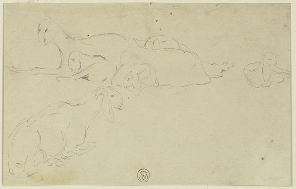 Editor: This lovely, simple drawing, "Grooming Cat," created in the 17th or 18th century by Friedrich Wilhelm Hirt, is done with chalk and pencil. It's so sparse and delicate; the cat is almost disappearing into the paper. What can you tell me about its context? Curator: Well, what does a drawing of a grooming cat *mean* in the 18th century? We have to think about the rise of the bourgeoisie and their increasing desire for… domesticity. Pets move from utilitarian roles – catching mice – to objects of affection, symbols of a well-ordered household. Does this drawing play into that trend? Is Hirt simply capturing a scene from daily life, or is he subtly participating in this cultural shift? Editor: So, it's not just a cute cat? There’s a socio-political angle? Curator: Precisely. Consider the institutions displaying and collecting such works. Are they reinforcing ideas about taste, class, and proper domestic life? The Staedel, for instance, plays a role in defining "high" culture. What is canonized, what is excluded? How does the image of a commonplace pet fit into that? Editor: I guess I hadn't thought about art of everyday life also having something to say about power dynamics. Curator: Indeed. What about the way it is depicted – just a sketch. What statement is Hirt making about artistic process, patronage and audience by presenting an unfinished sketch, so simple in tone? Is this presentation related to a shifting audience and public view of 'acceptable' art? Editor: That’s a great point. I never considered a simple sketch would speak volumes, it is definitely worth reflecting on the many meanings the presentation implies. Curator: Right!