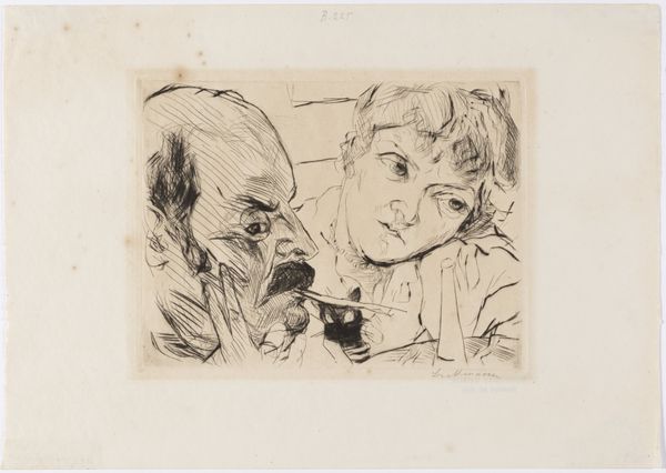 Curator: Let’s discuss Max Beckmann’s "Self-Portrait, Hand to Cheek," created in 1916. It's currently housed at the Städel Museum. Editor: The first thing that strikes me is the stark rawness of the etching. The intense, almost frantic lines feel like they are clawing their way off the paper. It’s immediate and unsettling. Curator: I see that, and I think it resonates powerfully with the historical context. Beckmann created this during World War I, a time of immense societal upheaval. His service as a medical orderly on the front lines exposed him to horrors that deeply affected his worldview, leading to his well-documented depression. This print should not be seen as simply an artistic endeavour, but a profound statement on his psychological condition during a period of societal trauma. Editor: Absolutely, the weight of that experience seems almost physically imprinted on the work. But what’s interesting to me is how the very technique – the harsh etching process – mirrors this psychological burden. The lines, the way the acid bites into the metal, it’s almost a violent process, reflective of the violence experienced by those who participated. The material aspect is vital to its success. Curator: Indeed, and it raises interesting questions about masculinity during wartime. He's not depicting himself in some heroic pose, but rather vulnerable, thoughtful, perhaps even despairing. That challenges traditional notions of masculine stoicism expected at the time. Moreover, this introspection can be seen through a lens of a post-war re-evaluation of men's roles. Editor: Yes, there’s a distinct lack of idealisation. We're not seeing a glorified warrior. It's a raw portrait of a man grappling with internal turmoil, rendered through laborious process. The deliberate use of the etching and engraving techniques reflects the sheer struggle, or 'labor,' necessary to produce an image of the self under such distress. Curator: Precisely. The hand against the cheek can be read as both a gesture of contemplation and of profound weariness, suggesting a deep disillusionment that challenged patriotic narratives of the era. The self-portrait, then, turns into something bigger - a quiet criticism. Editor: Ultimately, it becomes a potent reminder that the tools and materials used by an artist aren’t neutral, they're integral to understanding both the work and the moment in which it was created. Beckmann, in etching his trauma, shows the world it through a visual equivalent to what was happening in society, and within him. Curator: Absolutely, it shows how close and yet, far from these feelings and concepts that, hopefully, most will never feel nor realize. Editor: Agreed, hopefully its ability to engage emotions, without relying on an accurate translation is powerful enough.