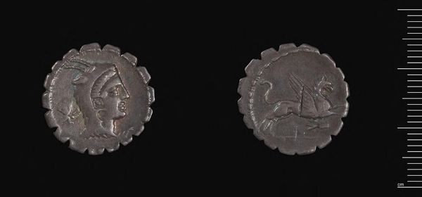 Curator: Let's consider this Serrate Denarius of L. Papius, a Roman coin found within the Harvard Art Museums collection, crafted by the moneyer L. Papius. Editor: It's lovely! There's something about the worn metal and those serrated edges that makes it feel ancient and a bit mysterious. Curator: Indeed. The depiction of the Roman figure on one side and the griffin on the other evokes powerful symbols of Roman authority and mythological strength, respectively. The figure's gender and status can be further examined in terms of historical gender roles. Editor: Absolutely. It’s amazing how such a tiny object can hold so much history and symbolism. You can almost feel the weight of the past in your hand, can’t you? Curator: Definitely! Examining its circulation and socio-economic impact further contextualizes its role within the Roman political landscape. Editor: I'm leaving with a sense of wonder about all those hands it might have passed through. It's like a tiny time capsule.