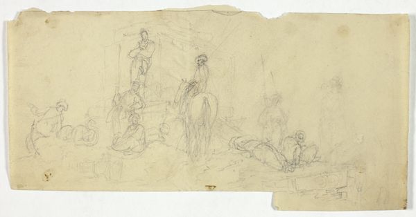 Editor: Here we have "The Torch Relay," a red-chalk drawing on paper by Philipp Veit, circa 1832. I'm immediately struck by the dynamism here, the way Veit uses these strong lines to convey movement. How do you see this piece fitting into its historical moment? Curator: That dynamism you observe is quite telling. This drawing comes from a period steeped in Romantic ideals and rising nationalism. Consider the very subject matter: a torch relay, inherently symbolic of passing on knowledge, tradition, or perhaps even revolutionary ideals. Veit, as a key figure in the Nazarene movement, aimed to revive spirituality in art, rejecting what they saw as the cold classicism promoted by the French Academy. Editor: So, the choice of the torch isn't just aesthetic, it's a statement? Curator: Precisely. Think of the institutions that historically controlled art. Academies dictated style and subject. But artists like Veit were forging new paths, quite literally relaying a "torch" of artistic vision. His engagement with the themes of history and moral purpose in the torch relay suggests his strong commitment to a reformed, morally elevated artistic practice, opposing to dominant academic system. Notice also how the sketch, rather than a finished painting, leaves space for interpretation. This very incompleteness becomes part of its political statement. Editor: That's a fascinating way to consider the artistic choices in this drawing. I hadn’t considered the "unfinished" aspect as a challenge to established norms. Curator: It invites us to reconsider the artwork’s production within the socio-political milieu. Are there other elements in the work you'd now interpret in this way? Editor: Now that you mention it, the figures' almost classical garb, contrasted with the rough, sketch-like quality, makes it seem like he is intentionally mixing traditional imagery with a modern sensibility. Thanks, that sheds new light on this piece for me! Curator: And for me too, reflecting on how we read artistic statements.