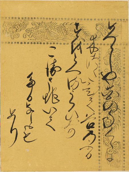 Curator: This is a page of calligraphy, titled "The Broom Tree," from Chapter 2 of The Tale of Genji. Editor: It feels very intimate, like a handwritten letter found tucked away. The blue is unexpectedly calming, and the script dances on the page. Curator: Indeed. The calligraphy is by Konoe Hisamichi, a figure of great cultural importance although we lack specific dates for his life. The Tale of Genji, a cornerstone of Japanese literature, holds immense cultural weight. Editor: I’m struck by the ornamentation; dragons intertwined with geometric patterns. It creates this gorgeous tension between the rigid and the flowing. Curator: The dragon is a common motif in Japanese art, often symbolizing power and good fortune, and its presence reflects the importance of the text and the patron who commissioned it. Editor: It's also incredible to imagine the stories these characters contain, the layers of history and emotion embedded within them. Curator: Absolutely. The Broom Tree hints at the complexity of the Genji story, touching upon love, loss, and courtly intrigue. Editor: This small page whispers of worlds beyond. It’s a reminder that art can be both personal and powerfully universal. Curator: A testament to the enduring legacy of the written word and the visual arts.