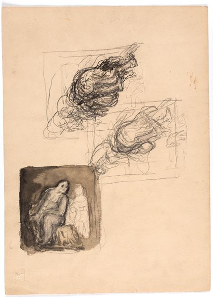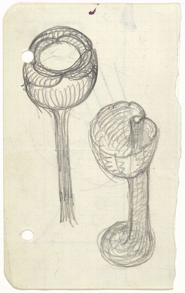 Curator: Welcome. We’re looking at "Ontwerp voor een miskelk (?)," a drawing potentially outlining the design for a chalice by Mathieu Lauweriks, likely created sometime between 1874 and 1932. It's a fascinating array of lines in pencil and ink. Editor: It does feel like a nascent idea captured swiftly. The lightness, the repetition… it reminds me of quickly jotting down variations in a notebook. It’s got that lovely energy. Curator: Yes, observe how Lauweriks plays with symmetry. The mirroring in the stem designs, for instance, is crucial. The proportional relationships here establish an aesthetic rhythm, don’t you think? Note too the geometric underpinnings to all the objects here, particularly the chalice sketches. Editor: Indeed. The geometric framework certainly feels intentional. Yet, for me, the incompleteness evokes a sense of yearning, perhaps. Chalices are traditionally associated with rituals, offering, even sacrifice. I see the hesitant lines, not as indecision necessarily, but rather as reverence. A sensitivity toward such potent symbolism. Curator: I understand your perspective on the possible liturgical use, however what grabs me are the individual parts; taken alone, each is nearly abstract. Lauweriks here dissects form with subtle modulations in tone, making each component distinct and autonomous, irrespective of its broader connection within a symbolic order. Editor: And that distinction between component and symbolic whole feels key. One wonders about Lauweriks’ intent. Was it solely formal exploration, or did deeper iconographic considerations inform this fleeting design? Perhaps this visual ambiguity strengthens its appeal? Curator: Exactly! By giving each component structural prominence and a balanced formal logic, he achieves more than a mere representation, it provides space for individualized reception by observers today. Editor: So, while the question mark in the title appropriately leaves space for doubt regarding the specific liturgical destination, there's an undeniable sacred feeling embedded, and in Lauweriks' skillful management of line and light. It is an excellent example of imbuing geometric precision with emotive depth. Curator: A masterful, incomplete sketch that shows us the value of considering parts over programmatic assumptions when thinking through graphic intent and affect. Editor: I completely concur. And that potentiality adds layers of meaning as a timeless quality to it all.