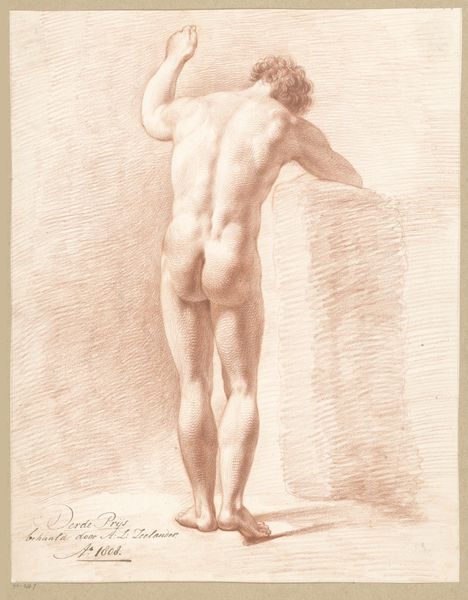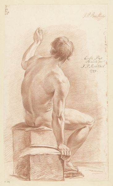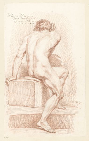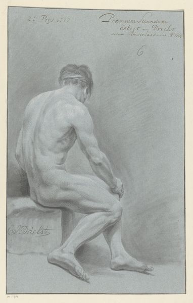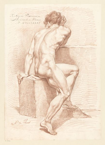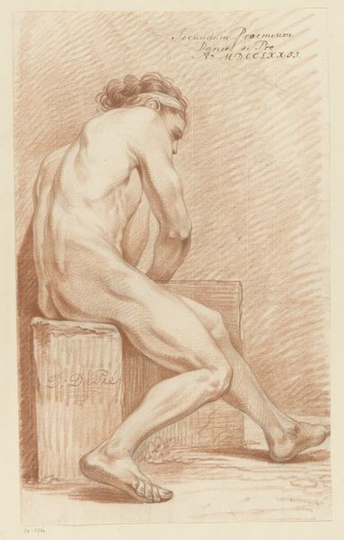 Editor: This drawing, titled "Zittend mannelijk naakt, op de rug gezien" by Abraham Lion Zeelander, possibly from 1812-1814, is quite striking in its simplicity. It depicts a nude male figure, viewed from the back, rendered in what looks like pencil. There's a clear emphasis on form and anatomy. What do you see in this piece, considering its historical context? Curator: I'm immediately drawn to the pose – the slight torsion of the torso, the way the light falls across the muscles. It evokes a sense of classical contrapposto, a very specific memory embedded in our understanding of the human form. Consider that this piece apparently won second prize in 1812. Academic art of that era was heavily influenced by classical ideals and the nude figure as a symbol of virtue and idealised beauty, yet with a palpable shift in focus towards realism. What emotional weight do you think that balance between idealism and realism might carry for the viewer? Editor: That's an interesting point about the contrapposto connecting it to classical ideals! I hadn't considered how it both adheres to and maybe even subtly challenges those traditions. Is it also fair to say that such figures are more like studies rather than posed figure? Curator: Precisely. Drawings such as this offer us direct insights into the artistic processes of the time. By studying the anatomical structures that constitute a human form, a pursuit rooted in Enlightenment era knowledge, do we enhance our appreciation of idealised beauty, or do we demystify the naked form, exposing humanity’s fragile imperfection? How might contemporaries view this depiction, armed with such associations? Editor: So it becomes more about exploring the nuances of the human body and our relationship with it, culturally and psychologically. This has been incredibly insightful. Thanks for your perspective. Curator: And thank you. Looking at art through multiple lenses unveils cultural echoes, which shapes a deeper connection between us and artworks from centuries past.