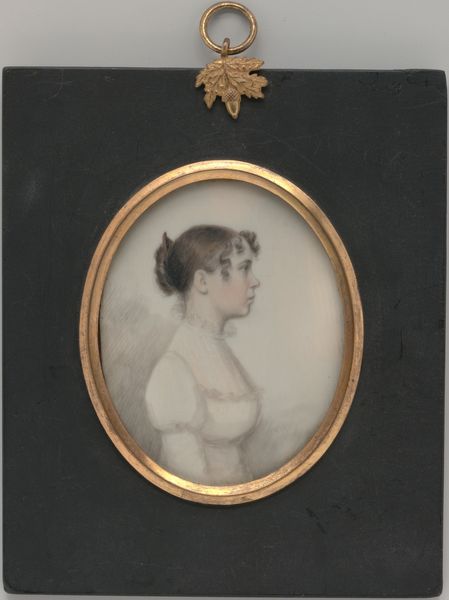 Editor: This is Louis Antoine Collas’s "Portrait of a Lady" from 1816, done with tempera on, well, something! It's very small, a miniature, really, and framed beautifully. The lady herself seems demure, yet those roses in her hair hint at something more...What do you make of this piece? Curator: Indeed. Notice the oval frame within the rectangular one—like a locket holding a secret. Miniatures like these weren't just portraits; they were symbols of affection, tokens of memory. Think of the roses: symbols of love, yes, but also of ephemeral beauty, *memento mori*. This 'lady' isn't simply a likeness; she's an emblem. What story might she be telling us with her image, in relation to the person for whom it was painted? Editor: So it's about more than just appearances. What do you mean by "cultural memory?" Curator: Look at the Neoclassical style, deliberately recalling the idealized forms of antiquity. It's a conscious choice to align herself, or rather, *himself* - the person who commissioned the piece - with those virtues: order, reason, and beauty, anchoring this portrait in a specific cultural moment, while transcending it to become something lasting. Now, imagine holding that locket in your hands…what does it whisper to you? Editor: It feels...intimate, like holding a tangible piece of history. I never considered how the style choice could connect the subject to those bigger cultural ideas. Curator: Precisely. And understanding those connections helps us see beyond the surface, into the heart of the image. It’s all about decoding the visual language. Editor: Thanks, I see it in a new way now, appreciating the context. Curator: My pleasure. Every picture holds a universe of stories, waiting to be discovered.