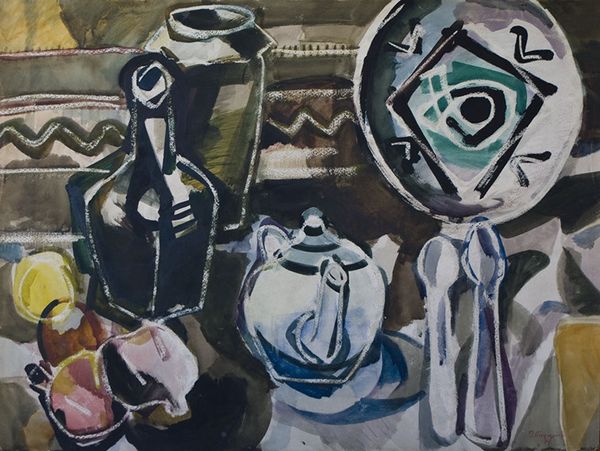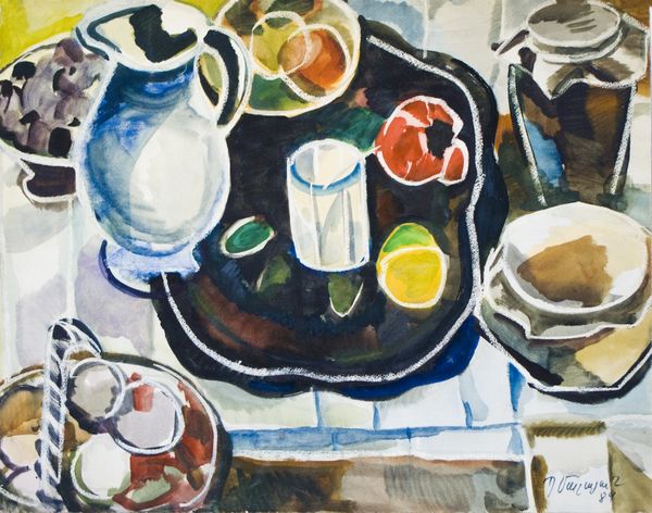 Curator: Petros Malayan, born in Armenia, created "Still Life with Fruits" in 1978. It is rendered with watercolor on paper. What is your immediate reaction to this piece? Editor: A domestic tableau with a touch of wistful serenity, if that makes sense. There’s a quietness in the colors and the slightly obscured forms, hinting at everyday rituals. It almost feels like memory taking shape. Curator: Yes, I agree. The loose application of color washes invites a conversation about tradition. Still life, particularly fruit, holds complex socio-economic connotations tied to consumption and colonial exchange. Given the Armenian artist, I find myself wondering if this is in conversation with Western painting. Editor: Perhaps, or it's engaging in something more timeless. Think of the fruit, the vessels—they are universal symbols. The plum, the pitcher...aren’t these elemental images of hospitality and bounty? Curator: Absolutely. But I wonder if there’s a conscious engagement with the fraught histories surrounding Armenian identity and displacement in the Soviet Era. Was this artistic style permissible at the time? Editor: It appears he’s drawing from Post-Impressionism and early Modernism. The flattened perspective feels informed by Cézanne. But perhaps the emotional resonance speaks to something deeper. Consider, for instance, the objects themselves: humble fruits alongside a seemingly European tea service. Could that pose quiet tension? Curator: Yes! And, I do notice the very visible signature in the lower corner. Was he allowed artistic visibility? Did he identify as Armenian first and foremost? I am curious to learn more. Editor: Visual symbols hold layers of time. Malayan used everyday objects, things we intrinsically understand. They speak across languages and experiences and allow us to connect with him. I see beauty in how accessible it remains. Curator: Agreed. This watercolor encourages a broader, more humane dialogue. Despite its subtle elements, the simple still life genre becomes a profound vehicle to express identity, and perhaps resistance, against a broader cultural-political context. Editor: Absolutely, now I look forward to researching his visual language within that scope even more. Thank you! Curator: And thank you! It’s inspiring to witness these fruits carry such complex narratives.
