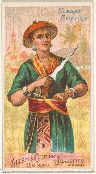 This small card, ‘Seimseim, from the Musical Instruments series,’ was made around 1900 by W. Duke, Sons & Co., purveyors of tobacco products. The chromolithographic printing process allowed for the cheap reproduction of images. In this example, we see a woman, perhaps in a geisha-like persona, playing a stringed instrument. The details here are fascinating, as the flat, thin card stock allowed for mass production, while the design exoticized a culture, all to promote a commodity: cigarettes. The card’s materiality is also indicative of its social context: it reflects the rise of consumer culture and the use of images to sell products. It is a reminder of how art can be used to promote consumerism and perpetuate stereotypes. Looking at this card, we can see how seemingly disparate aspects of culture – art, commerce, and social attitudes – are intertwined. This teaches us that the meaning of an artwork goes beyond its aesthetic qualities, requiring us to understand how it participates in wider cultural and economic systems.