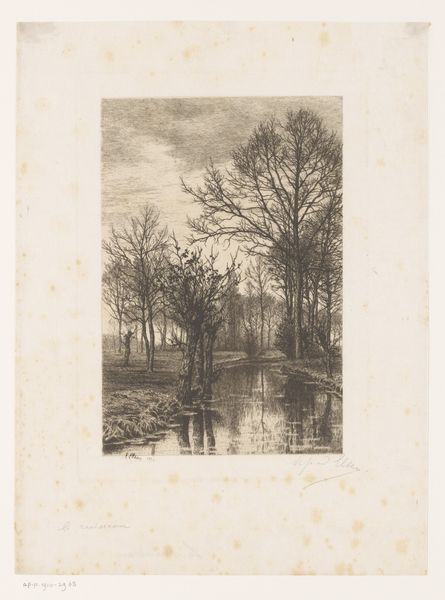 Editor: This etching, "Vijver bij maneschijn" or "Pond by Moonlight," is attributed to Jules Guiette, dating from 1862 to 1901. There's a stillness to it; a quietness. The bare trees reflected in the water create this ethereal, almost ghostly feel. What strikes you most about this work? Curator: That stillness, I think, speaks volumes. We're not just looking at a pretty landscape. Consider the period: the late 19th century, a time of immense social and political upheaval. The industrial revolution was transforming society, and there was this deep current of anxiety about nature being lost to progress. Editor: So, this quiet pond… Curator: …becomes a space of resistance, or perhaps mourning. Think about who had access to these spaces, both literally and figuratively. Nature, and depictions of it, weren't always neutral. The Romantics idealized it, often ignoring the realities of rural labor, for instance. Does this etching continue that tradition, or does its quietness invite a more critical contemplation? Editor: I hadn't considered that perspective. The lack of people in the scene now feels deliberate. It’s a landscape devoid of labor, of exploitation maybe. Curator: Precisely. It asks us to consider whose gaze is privileged and whose stories are erased. The moon, often associated with femininity and the cyclical, might also be seen as a challenge to the patriarchal structures of the time. Editor: It's interesting how something so seemingly simple can hold so many layers of meaning. I see the image differently now, not just as a depiction of a landscape, but as a commentary on society. Curator: Art is never created in a vacuum, is it? Looking closely, thinking critically - that’s how we uncover these dialogues, even in the quietest of landscapes.