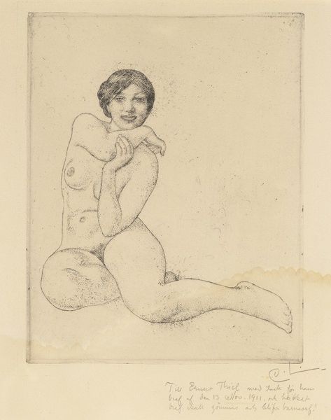 Curator: Looking at "Nude Woman Seated," an etching by Theodore Roussel, what strikes you first? Editor: The contrast. It feels intimate and withdrawn at once, like catching someone unawares in a quiet moment. What about you? Curator: I think the artist skillfully utilizes line and shading. You can almost feel the texture of the paper beneath the etching; notice the cross-hatching creating those shadow areas. Considering the print medium, it must've taken meticulous labor to achieve this effect. Editor: Absolutely, etching's a patient craft! I wonder about the paper's sourcing. Was it hand-laid? What were the material conditions of Roussel’s studio like? And this choice of a nude figure: how does this play into broader representations of women at that time? The art historical context really brings another layer, right? Curator: The female form has always been a source of contemplation in art history. Yet, there’s something melancholic about her gaze; you wonder what's running through her mind. Maybe the "rawness" comes from knowing Roussel himself was an outsider, never fully embraced by the British art establishment. Maybe it seeped into the artistic vision here. Editor: Interesting angle! To me, her expression seems more related to the alienation of labour. Consider that this wasn't some commissioned masterpiece for an elite patron. Was the model a professional or someone he knew? Paying her, ensuring her safety— all these interactions inform the final product. It adds a human dimension to that wistful air. Curator: That reminds us every piece reflects the social realities and production of its time, the artist's heart laid bare, flaws and all! Thanks for helping me notice these subtleties. Editor: Always a pleasure to dive deep into the material, both physical and historical! It just shows that even a seemingly simple etching like this contains a multitude of stories!