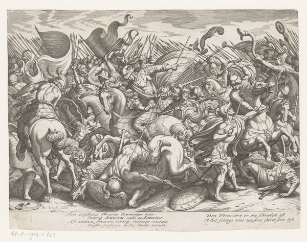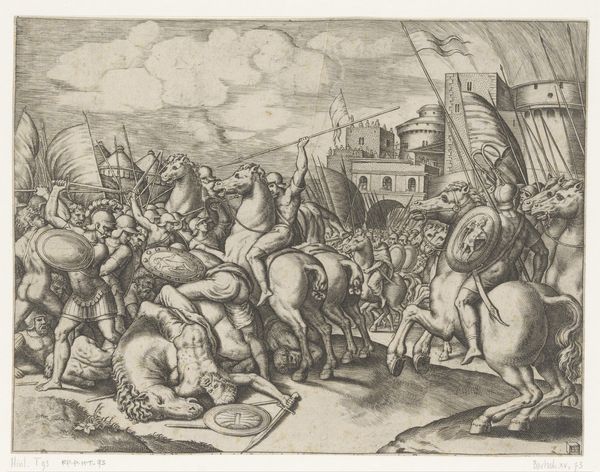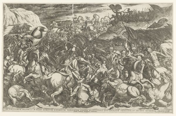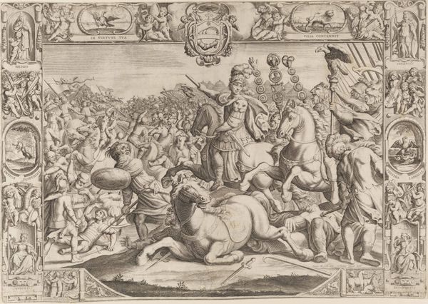 Francesco Villamena made this print, the Battle of Gaugamela, with etching and engraving, sometime around the turn of the 17th century. The image depicts Alexander the Great’s decisive victory over Darius of Persia in 331 BC, though it's less concerned with historical accuracy than with glorifying military might. Consider the context: Rome, a papal state, was then a center for the production and dissemination of art. The print medium allowed artists like Villamena to circulate imagery widely, shaping public opinion and reinforcing the power of the Church. The eagle and putti at the top are not ancient symbols, but emblems of divine favor, suggesting that Alexander’s victory was divinely ordained and, by extension, that Rome's military power had a similar source. The image thus comments on the social structures of its own time. By studying sources such as military history, religious iconography, and printmaking techniques, we can better understand how artworks like this reflect and shape the cultural landscape of their time. Art's meaning is contingent on its social and institutional context.