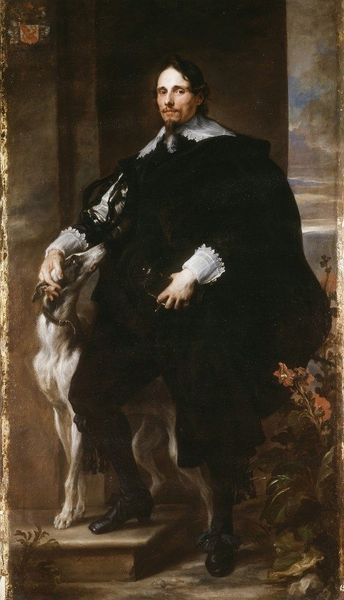 Curator: Here we have Anthony van Dyck’s "Portrait of Marguerite of Lorraine, Duchess of Orleans," executed in 1634, and now held in the Uffizi Gallery. Editor: There's a somber weight to the painting; the sheer volume of dark fabric overwhelms the Duchess. It almost feels like mourning, despite the bright crimson backdrop. Curator: Indeed. Notice how Van Dyck employs a limited palette, primarily contrasting the deep blacks of her dress with the bright red curtain, and the soft luminosity of her skin. It's a study in texture as well—the velvet against the delicate lace. Editor: And the subtle details. She's holding a rose. Red roses often symbolize love, passion, but the almost withered state of this one adds a layer of poignancy, maybe unfulfilled desires, or lost youth, considering that she married in exile. Curator: An insightful observation. One must also appreciate the compositional balance Van Dyck achieves. The implied diagonal created by the drapery counters the verticality of the Duchess’s figure, creating a subtle dynamic tension. Editor: Beyond its formal qualities, the red drape carries historical weight; it immediately signifies royalty, grandeur, perhaps a veiled reference to the stage of history itself on which Marguerite plays her role. A role which, based on her dark gown, could imply a lack of power. Curator: Yes, one can certainly interpret the crimson curtain as emblematic of her status as a Duchess. Although, let us consider that such color was commonly utilized to compliment the high class status and appeal to an aristocratic sensibility. Editor: A crucial reminder not to leap to premature conclusions based only on semiotics, and to appreciate the power of sheer artistic design as its own symbol, indeed. Curator: Well, I think examining both Van Dyck's choices and his subject matter has given us a comprehensive insight into the Duchess’s portrait and it’s position amongst the Uffizi’s artwork. Editor: Indeed. Whether through signs, symbols, or the sheer arrangement of pigment, artworks often reflect the soul of their creators and their subjects alike.