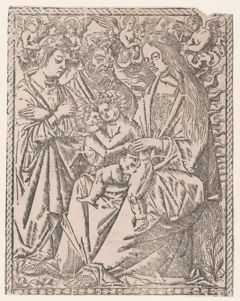 Curator: What a fascinating block print. This piece, dating from 1455 to 1465, is titled "The Bridegroom Offering a Crown to the Bride from a Canticum Canticorum blockbook, 2nd edition". It’s anonymous, a true product of its time, showcasing themes from the Song of Songs. Editor: It strikes me as oddly tender, yet formal. The figures are carefully delineated, but there’s something ethereal about the line work, a lightness that’s almost surprising given the religious context. Curator: Indeed. Considering its likely role in conveying biblical narratives to a largely illiterate population, the visual language here speaks volumes. Notice the deliberate staging of the scene and the stylized drapery; they aim to instill reverence. I would like to highlight the identities represented here, as there may be themes relating to patriarchal notions of power that inform these narratives. Editor: I agree. Thinking about the means of production—the laborious carving of the woodblock—it really emphasizes the collaborative aspect of medieval art-making. This isn’t just one artist's vision; it's the culmination of skills, resources, and patronage of many to realize the vision. Curator: Precisely. We can view the print as not just a religious image but as a tangible reflection of the societal structures. The iconography would dictate strict interpretations around duty, obligation, and social hierarchy for medieval people consuming the imagery. Editor: And looking closer, the roughness of the print gives a human touch; each impression slightly different. Imperfections in production would inevitably vary slightly with each block printed from the wood block, providing some differentiation to multiple uses of this imagery. This print serves not only a spiritual end, but it is a material testament to work in the print shop. Curator: The presentation is really interesting as well, how different artistic conventions affect different meanings. Editor: I find this block print to be a remarkable blend of artistic expression and societal imprinting. Its raw simplicity opens up an appreciation for process and societal intention in the Middle Ages. Curator: Ultimately, the print provides an opportunity for discussions on gender, religious roles, and societal implications, thereby continuing the impact it may have had in the fifteenth century.