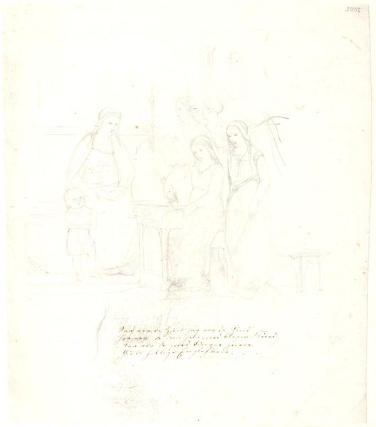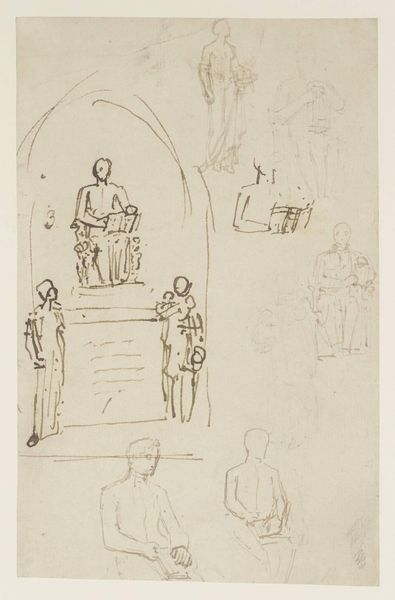 Curator: Here we have a drawing by John Flaxman, titled "Design for the Setting of a Classical Statue; and a Farewell Scene, Figures in Classical Costume". It's held at the Tate Collections. Editor: Oh, it feels intensely fragile and vulnerable. The spare lines, the slightness of the figures... it whispers of loss and reverence. Curator: Flaxman, who lived from 1755 to 1826, was deeply immersed in classical themes. This sketch probably relates to his designs for sculpture or even theatrical productions. Notice how the top scene presents a statue almost as a deity to the crowd. Editor: Yes, it's like the statue is receiving their adulation. And below, that farewell scene... the figures intertwined, it suggests the human cost of grand narratives. It's a raw emotive juxtaposition. Curator: Flaxman was working during a time of revolution, a period that loved the grand spectacle. Editor: A moment that also understood sacrifice, which Flaxman understood too. Both scenes, grand and intimate, capture those feelings perfectly. Curator: A quiet reflection from a time of great social upheaval. Editor: Yes, a beautiful pairing of private grief and public spectacle, rendered so delicately.