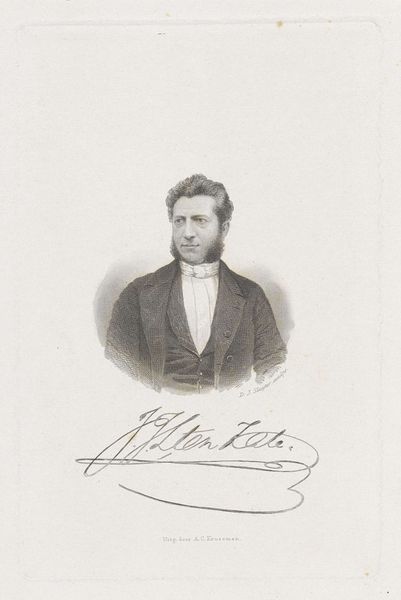 Editor: This is "Portret van de dichter en predikant Jan Jacob Lodewijk ten Kate," a graphite drawing from 1842 to 1873, held at the Rijksmuseum, created by Dirk Jurriaan Sluyter. The work feels very formal. The sitter is very serious. What symbols or imagery stand out to you? Curator: It's fascinating how this image carries a weight of respectability. Consider the beard, a strong symbol of Victorian masculinity and intellectualism. Note its carefully sculpted shape. Does that suggest anything about Ten Kate’s public image? How did people view clergymen and poets in this era? Editor: That controlled presentation definitely speaks to wanting to project a certain persona. Maybe that seriousness was part of being seen as trustworthy? Curator: Exactly. This links to the broader cultural understanding of religious figures. Also, look at the implicit narrative suggested through the drawing medium itself. Graphite renders soft lines. This softens what could be a stern image of masculinity. Why might the artist have chosen graphite rather than, say, oil paints, to portray Ten Kate? Editor: Maybe graphite implies something more approachable? Perhaps a less intimidating vision of leadership than if it had been rendered in something weightier like oil? Curator: Precisely. The medium reinforces an important cultural dialogue. Ten Kate isn't just a face. He is a representative of deeply rooted social and cultural values, intentionally shaped through symbolic choices. What new understanding has shifted for you, looking more deeply at this work? Editor: Thinking about it now, seeing it just as a portrait is reductive. It's like a mirror reflecting an entire society's expectations, all channeled through one person. Thanks! Curator: Indeed. It becomes less about the individual, more about the visual language used to reinforce power and morality.