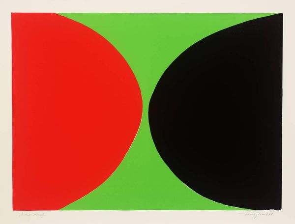 Curator: Patrick Heron's "Two Pink Discs in Dark Reds," from April 1970, presents us with a bold statement in color and form. Editor: It strikes me as unexpectedly cheerful. The bright pink and red give off a definite sense of optimism, even if the composition is quite simple. Curator: Heron was deeply engaged with the materiality of paint and color relationships. Consider the screen-printing process here, how it flattens the space and emphasizes the interaction of hues. Editor: Absolutely, but it's also worth noting that Heron was working during a period of significant social and political upheaval. How might the turn to abstraction be read in that context? Curator: Well, the piece certainly invites us to focus on the pure visual experience, bypassing traditional representation. The choice of screen printing makes it accessible, almost a democratic mode of production. Editor: Perhaps, but its display in galleries and museums also frames it within specific power structures. The image becomes part of the institution. Curator: A compelling point. This piece is a stimulating reminder of how we engage with art on multiple levels. Editor: Indeed, and how even the most straightforward-seeming image can hold layers of meaning.