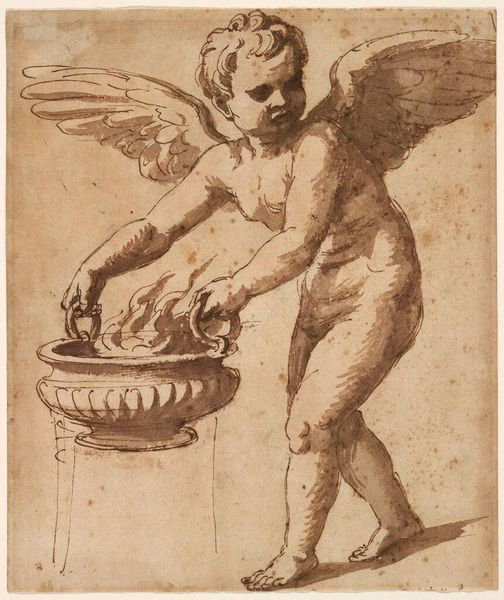 Editor: Here we have, "Blindfolded Amor Carrying a Bow and Flaming Torch," attributed to Georges Lallemant. It’s a beautiful, detailed drawing, but something about the blindfold feels unsettling. What do you make of it? Curator: This drawing reflects the powerful influence of classical mythology on art academies. Amor, or Cupid, is often depicted blindfolded to symbolize the irrationality and often arbitrary nature of love. But, what kind of social messaging do you think an image like this was meant to convey? Editor: I guess it suggests love is blind and unpredictable, maybe uncontrollable. Curator: Exactly. And who controlled the narrative around love, marriage, and family in the societies that created and consumed images like this? Consider the power dynamics at play. Editor: That’s a really interesting point. It makes me see the drawing in a whole new, more critical light. Curator: Understanding the social context is crucial to interpreting art. It shapes both its creation and reception.