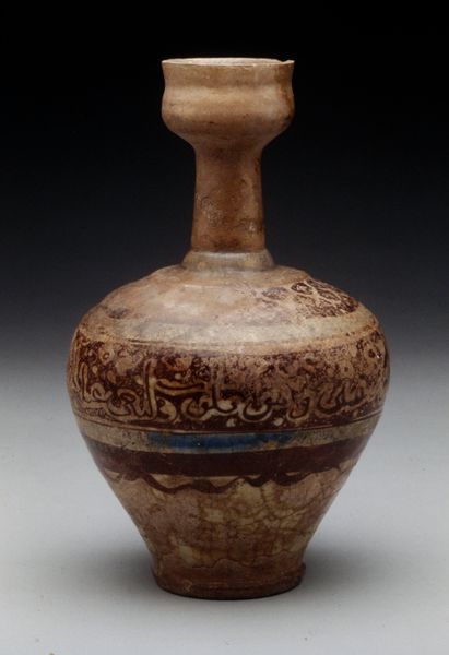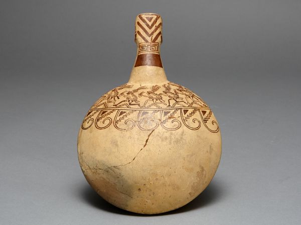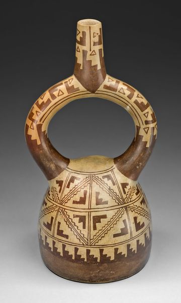 Curator: This is a stirrup spout vessel, crafted by the Moche people between 201 and 800 AD, now residing here at the Minneapolis Institute of Art. The vessel is primarily ceramic. Editor: Its form strikes me first – that unusual stirrup handle rising from a bulbous body. It’s weathered, clearly ancient, but the geometric patterns still convey a graphic quality. Curator: The stirrup spout is quite characteristic of Moche pottery, isn't it? These vessels weren't just utilitarian; they served as potent forms of communication and status display. Analyzing the iconography helps us decode aspects of their worldview, ritual practices, and social hierarchies. Editor: And speaking of the iconography, you’ll note its decoration: What’s immediately striking is the repetitive nature of the decoration. It's all made of earth-borne materials too. One wonders about the labor that went into extracting the materials, forming the vessel, painting it so elaborately, and finally firing the ceramic. The skill is evident. Curator: Absolutely. Consider that this was likely created within a workshop setting, where artisans specialized in different stages of production. This division of labor allowed for increased efficiency, reflecting the complex social structure of the Moche. Editor: Do we know if the patterns and figures convey a certain function or meaning within that community? Curator: Undoubtedly, though the specifics are debated. Some scholars interpret the imagery as depicting mythical narratives or scenes of everyday life. The ability to decode and circulate this kind of imagery solidified power structures. Access to such refined ceramic objects would have also been a signifier of social status. Editor: Seeing the repeated forms gives the piece almost an industrial feel despite being handcrafted and ancient. Thinking about it makes one ponder how things like raw materials, processes of production, and access to luxury work today. Curator: Yes, it forces us to reconsider what we mean by concepts of labor and artistic expression, especially given our Western-centric perspectives on what counts as art. Studying works like this broadens our understanding of the diverse roles that visual culture has played in societies across the globe. Editor: Looking at the vessel closely, appreciating its texture and pondering its place in the distant past offers an experience that encourages a more thoughtful look into labor and art history. Curator: Agreed, it provides insight not just into a distant past, but reflects how we, as viewers, are embedded in global exchange networks of labor, materials, and meanings today.