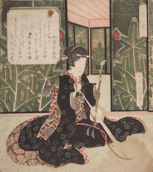 Editor: This lovely Japanese woodblock print, "Fashionable Figures of Beauties of Summer" by Kikugawa Eizan, depicts a woman gazing into a mirror. It feels incredibly intimate, like catching a private moment. What do you make of this scene? Curator: It whispers of fleeting beauty and the quiet rituals of adornment. The mirror reflects not just an image, but a question: What is seen, and what is unseen? Does the fan hint at the world outside, a world of bridges and connections, or does it amplify the interior space? Editor: That's a beautiful way to put it. I hadn’t considered the fan as anything more than decorative. Curator: Beauty isn't just a surface; it’s a reflection of inner contemplation. We gaze at her gazing, and in that shared act, perhaps we glimpse a bit of ourselves. Food for thought, no? Editor: Absolutely. It’s made me consider the layers of meaning behind such a seemingly simple image.