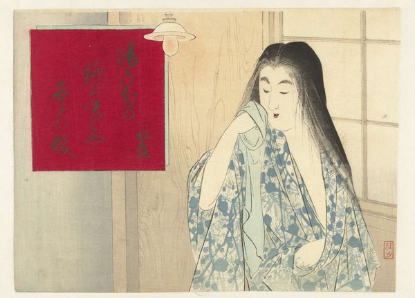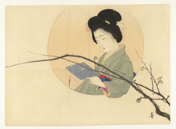 Editor: Here we have "Woman looking at a Bird" by Kajita Hanko, created sometime between 1900 and 1917. It's a watercolor, and the overall effect is so delicate and serene. The woman seems lost in thought, almost wistful. What’s your read on this piece? Curator: It’s fascinating how Kajita Hanko captures a sense of quiet contemplation. This work operates within a rich visual culture. How might we see this image participating in or responding to established genres like Ukiyo-e prints? Consider the evolving role of women in Japanese society at the turn of the 20th century. Does this image reinforce traditional ideals or subtly challenge them? Editor: That’s an interesting point! I guess I hadn't thought about it beyond the surface level. I see her more as an individual than a representation of a social role. Curator: Exactly! And how do you think the institution itself plays a role in forming that understanding? Because ultimately we view art, not from neutral position, but through our current socio-cultural condition. In fact, even Hanko was involved in forming the Nippon Bijutsu Kyokai or the Japan Art Association. His works and art related institutions contributed to establishing Japanesque art at the beginning of the 20th century. Editor: It’s wild to think that the way we perceive her is shaped by how collections choose to show her and similar works of art. Curator: Precisely! We need to examine the structures that condition both production and reception of art. Even the presence of this watercolour illustration hanging in Rijksmuseum is no coincidence, I believe. What might be at play here, historically? Editor: I’ll definitely have to think more about the artwork in relation to art market! This has been quite eye-opening. Curator: I agree. Looking beyond the surface lets us appreciate the complexities embedded within it.