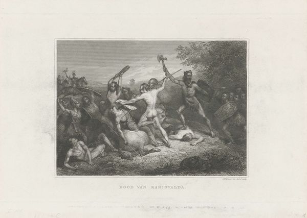 Curator: Let’s turn our attention to “Pyrrhus wordt gered,” or "Pyrrhus Saved," a 1676 engraving by Guillaume Chasteau, housed here at the Rijksmuseum. What are your initial impressions? Editor: It’s all very linear. I see lines etched in, with gradations for shading. So many figures in dramatic poses, kind of chaotic yet tightly controlled by the graphic. It's intense, busy, Baroque! Curator: Precisely. Chasteau, as a skilled printmaker, captured a moment of high drama from ancient history—specifically, the story of Pyrrhus, King of Epirus, being saved as an infant. Editor: And that is the core of the materiality here, a print. An image made for wider consumption, accessible because it is a mechanically reproduced image on paper. Who got to have these things? Curator: Exactly. Prints played a crucial role in disseminating knowledge and shaping public perceptions, especially about historical events or figures. This engraving, being a detailed depiction of an infant king and military figures, likely appealed to an elite audience. We can speculate this piece may have appealed to a politically invested, scholarly set with some coin. Editor: The landscape behind Pyrrhus seems staged, almost like a backdrop in a play. And those figures on the right – are they rushing towards or away from the infant? It seems ambiguous. Curator: A touch of baroque theatricality I think. Consider how the composition guides the viewer's eye through the narrative—from the besieged city in the background to the desperate act of rescue in the foreground. Each figure conveys intense emotion, from fear to determination. The print's impact depended on shared cultural knowledge and how people at the time felt and viewed historical and biblical figures. Editor: To create such nuance, you have to appreciate the skill to manipulate material; I notice cross-hatching and delicate linework for shadows and textures. A true feat of artisanal craft elevated by subject matter, the making process becomes almost as critical as the end product here. It makes the artist's own labor clear. Curator: A wonderful point. Now that you’ve pointed this out, it seems clearer that this piece provides insight into not only historical subjects, but those who make it their subjects of art. Editor: Absolutely! It leaves me considering how material choices influence historical interpretation.