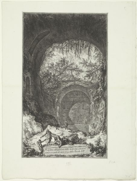 Curator: This engraving is Jacques François Blondel’s "Interior of the Temple of Bacchus," created between 1765 and 1767. Editor: Ooh, my first impression is it feels shadowy, like a stage set for a mysterious rite. All those columns and the dramatic lighting…almost ominous. Curator: Absolutely. Blondel, a prominent architectural theorist of his time, aimed to evoke the grandeur and moral weight of classical architecture, very much in line with the Neoclassical movement. Editor: So, the columns, the temple setting – that’s all about projecting power and permanence? It feels a bit…controlled. I wonder what Bacchus himself would make of it. He’s usually depicted with wild abandon, wouldn't you say? This seems almost designed to tame the divine. Curator: Indeed! This tension is exactly what fascinates me. It reflects how the Enlightenment sought to rationalize and categorize even the most ecstatic elements of ancient life. The print, rendered in such stark monochrome, presents the viewer with a world striving towards order and imposing it on what would have been previously understood as revelry. Editor: It almost feels like the rituals are being…documented, studied, rather than experienced. And who are these people? It’s hard to see. Curator: Likely members of a Bacchic cult participating in rituals honoring the god, who in Roman times presided over wine, fertility, and theatre. Consider the fire, the altar, and figures positioned as performers and observers to understand that tension. Editor: This is Neoclassicism at work. A moment of excess captured with a rational and objective lens. And made…safe for the salon? You know, as a devotee of ecstatic experience myself, I have very mixed feelings about this. Curator: As do I, honestly! I think that's why I keep returning to this print: it so elegantly, yet hauntingly, illustrates our fraught relationship with the past and our constant negotiation between order and freedom. It’s so revealing how the aesthetics become inherently political. Editor: Precisely. A fascinating relic, Blondel's interpretation allows us to look at the gaze through which cultures and ideologies are rendered and interpreted. A sober god in a charcoal dream.