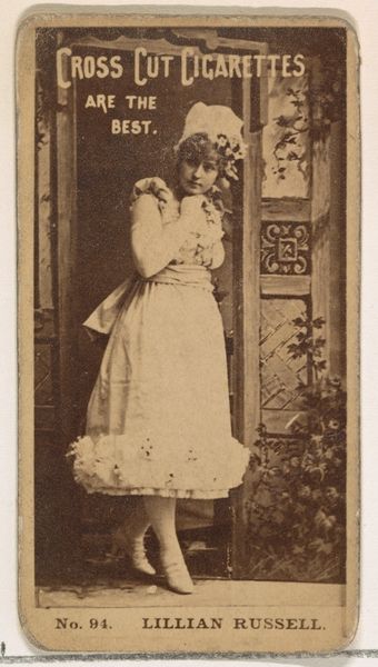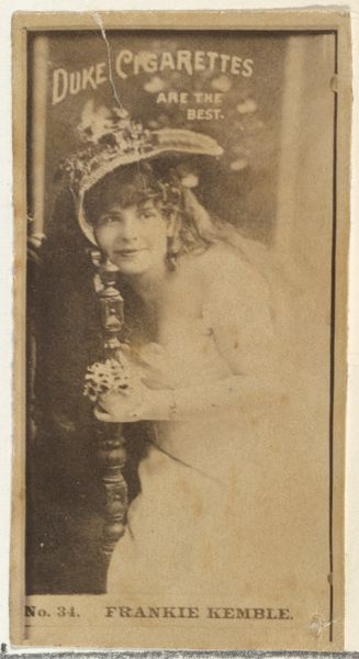 Curator: It's a small, sepia-toned photograph—card number 308 from the Actors and Actresses series, part of an advertisement for Cross Cut Cigarettes produced by W. Duke, Sons & Co. in the 1880s. It features actress Ireen Bickford. Editor: There's something undeniably intimate about it. The slightly blurred focus lends the image a dreamy, almost melancholic feel, despite the promotional nature of it. Curator: The Duke company produced these as trade cards, including them in packs of cigarettes. These cards were immensely popular; their circulation provided a kind of proto-mass media fame for these actors. In terms of the symbolism here, we see a clear connection to an emerging celebrity culture tied directly to consumerism. Editor: That’s right. The subject matter being an actress connects it strongly to themes of transformation and make-believe. And if you think about cigarettes, they were about escapism, performance of ritual, adulthood, social posturing. There’s almost an element of a pagan idol on the table nearby! Curator: Yes, absolutely. The card provided both an advertisement and collectible "artifact". It circulated images, creating idealized portraits available to all, as though you, too, could reach that level of fame or fortune simply by purchasing a product. And consider this also: by using an actress, Duke plays upon ideas of manufactured persona and idealized identity that still ring true today. Editor: And it works so well by capitalizing on existing visual archetypes: the stage star, the domestic goddess. But the connection of femininity, stage performance and the alluring cigarette make a potent symbolic recipe. Curator: Indeed. Examining objects like these trading cards helps to understand the complex intertwining of performance, desire, and the social aspirations of the period, packaged conveniently with your tobacco product. Editor: A fascinating example of a functional object elevated by the cultural narratives it carries.