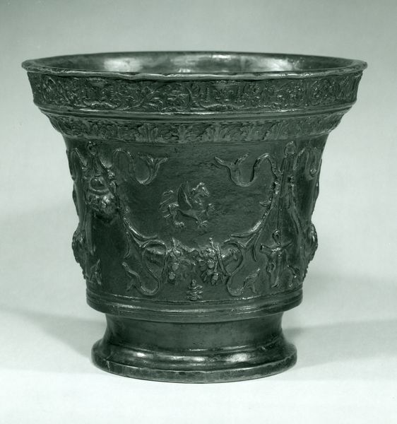 Editor: Here we have a ceramic wine cup, likely from the 20th century, currently held at the Minneapolis Institute of Art. Its surface is a mottled grey with incised decorations. I immediately think of medieval chalices when I see it. What symbolic readings jump out at you? Curator: The immediate connection to the medieval period is significant. Though it's a 20th-century piece, the conscious invocation of that era channels specific cultural memories. Note the vegetal patterns. They aren't simply decorative. What might they signify, considering wine’s cultural importance? Editor: Grapes, maybe? Wine, celebration, the Eucharist? Curator: Precisely. And what feelings or ideas does that layering of meanings evoke in you, when we consider that it's crafted in a ceramic material, giving it a humble aura rather than one of gold and precious stones? Editor: Well, that juxtaposition feels really interesting. The material suggests everyday use, or maybe even a copy meant for display, which alters its potential ritual significance. Does that contrast point to changing social relationships with religious symbols? Curator: It's a perceptive observation! This ‘everydayness’ you're feeling suggests a democratization of sacred imagery, allowing it to enter the domestic sphere and prompting new interpretations that may have diverged from those held during its time. Editor: I hadn’t considered that – it changes how I see it entirely. Curator: These objects act as memory vessels, carrying encoded messages across time and material, prompting viewers like us to continually reinterpret these cultural values, questioning continuity and change.