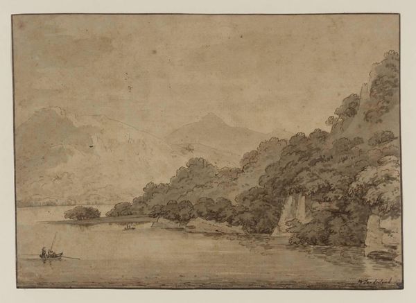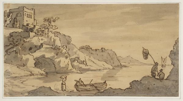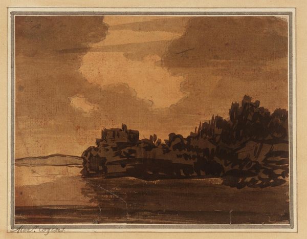 Curator: Here we have Alexander Cozens' "Coast Scene with a Castle on a Cliff," a small-scale work from the Tate collection. Its dimensions are a modest 100 by 161 millimeters. Editor: The sepia tones create such a placid atmosphere. The composition leads the eye gently across the water to that fortress perched so precariously. Curator: It’s interesting to consider Cozens' practice. The subtle variations in the ink wash, the way he builds form… it's all about the technique. Editor: Absolutely, and the lack of color is striking. It forces us to appreciate the subtleties of line and tone. Curator: It also speaks to the realities of artistic labor at the time—access to materials, the economics of artistic production. Editor: Perhaps, but I'm captivated by the emotional impact. The serene stillness, broken only by that lone structure on the cliff. Curator: I’m drawn to how the scene represents an era where nature and societal structure were intertwined. Editor: A wonderful demonstration of how form and context can converge to enhance our understanding. Curator: Indeed, thinking about both the process and the pure visuality brings fresh appreciation.