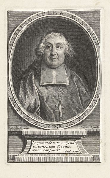 Curator:Editor: So, this is a portrait of Eustache Teissier, engraved sometime between 1666 and 1707 by Gérard Edelinck. It’s currently held in the Rijksmuseum. What I find most striking is the incredible detail achieved just through lines. What’s your take? Curator: Indeed! Edelinck's control of line is superb. He creates volume, texture, and even personality, simply through the density and direction of those little grooves he cut into the metal. I see a man of presence and maybe, a bit of…well, contemplation. But the rigid Latin inscription around the oval – that adds another layer, doesn’t it? What does that make you think of? Editor: It feels formal, important… like solidifying his status, I guess? All those weighty words kind of contrast with the more human portrayal of his face. Curator: Precisely! It's the Baroque love of drama in play! We've got the fleshy, almost intimate portrait set against the rigid structure of the Church. It’s a visual tug-of-war. The cross prominently displayed on his vestments tells us he's a man devoted to the Holy Trinity, dedicated to the redemption of captives. See the small heraldic crest at the bottom? What do you imagine its significance to be? Editor: Probably some important family emblem? Proof of his noble background, perhaps? Curator: Very likely! This engraving becomes more than just a likeness, doesn't it? It's a declaration of identity, piety, and belonging in a hierarchical world. Even the crispness of the lines – what do they say to you? Editor: That the engraver was crazy talented? It does speak of prestige – this wouldn’t be something quick or cheap, right? Curator: Absolutely. Printmaking in this era was a means of disseminating power and influence. Copies of portraits like this one would have circulated widely, solidifying Teissier's reputation amongst his peers. A well-crafted image could be just as powerful as the man himself. Editor: Wow, I didn’t expect there to be so much going on under the surface of one portrait! I’ll never look at an old engraving the same way.