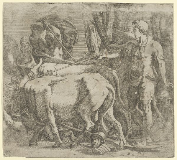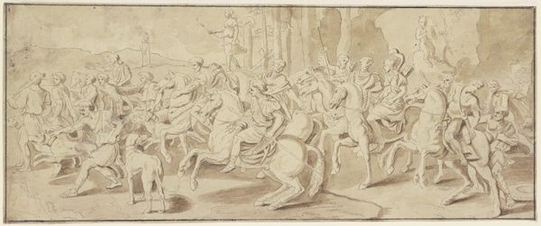 Taddeo Zuccaro created this drawing of Alexander the Great and Bucephalus using pen and brown ink with brown wash. Notice how the composition is constructed through dynamic lines and contrasting forms to create a sense of drama. Zuccaro uses a limited palette of brown tones, employing hatching and washes to model forms and suggest depth. The figures are rendered with energetic strokes that convey movement and tension. The rearing horse and the struggling figure of Alexander are positioned to create a diagonal thrust across the picture plane, contributing to the dynamism of the scene. We can see how Zuccaro uses light and shadow to emphasize the musculature of the horse and the straining body of Alexander, heightening the emotional impact of the encounter. Ultimately, the drawing captures a moment of intense action and struggle. Its formal elements, combined with the symbolic weight of the subject matter, invite ongoing interpretation and re-evaluation.