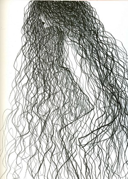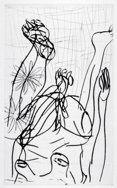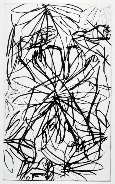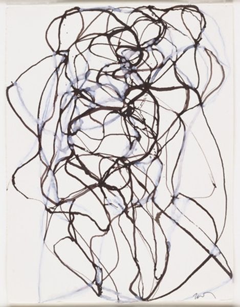 Editor: This is "Venus," a 1991 ink drawing by Brice Marden. All those winding, looping lines create such a dynamic feeling. It seems both chaotic and controlled, simultaneously. What's your take on this artwork? Curator: Indeed, the line is paramount here. Observe how Marden articulates form not through mass or shading, but solely through the trajectory and weight of each line. Consider the push and pull created by the density of line in certain areas versus the relative emptiness in others. This builds a kind of compositional tension. Do you perceive any discernible structure beneath the apparent chaos? Editor: I think so. I see hints of almost...geometric shapes interwoven, maybe triangles and circles? It’s subtle though. Curator: Precisely. Note how the relationships between the lines generate these implied forms. This creates a spatial ambiguity, a sense of depth and surface existing simultaneously. Semiotically, the white background becomes just as active as the lines themselves. It is not merely negative space, but an integral component of the overall structure. Editor: That's a great point. I was focusing solely on the lines, but the negative space really defines those shapes as well. Curator: Marden invites us to consider the very essence of drawing: line, form, and the dialectic between them. A pure investigation into visual language. Editor: This has totally reshaped my perspective, moving beyond a first impression to appreciate the artistic strategy at play here. Curator: An artwork like this reminds us that meaning arises from the internal mechanics of the piece, and a closer look shows more connections than may at first be expected.