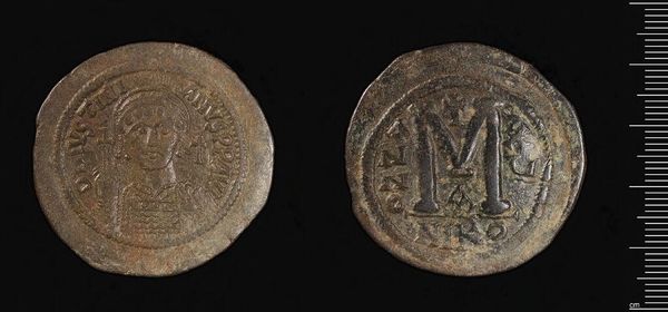 Curator: This is a coin of Justinian I, located at the Harvard Art Museums. The coin weighs about 22 grams. Editor: It's incredible how a small object can hold so much weight. The wear and tear speak volumes, don’t they? A tangible fragment from the past. Curator: Absolutely. Coins like these were crucial for disseminating the emperor’s image and authority. The portrait itself is a symbol, reinforcing his divine right to rule. Editor: And the large "M" on the reverse, signifying 40 nummi, visually anchored the Byzantine economy. The coin was a statement, both economic and ideological. Curator: Precisely. It reflects the power of the Byzantine state under Justinian, both materially and symbolically. Editor: To hold something like this, you feel a connection to the past, to an empire built on symbolism and power. Curator: Indeed, it’s a potent reminder of how even the smallest objects can carry immense historical and cultural significance.