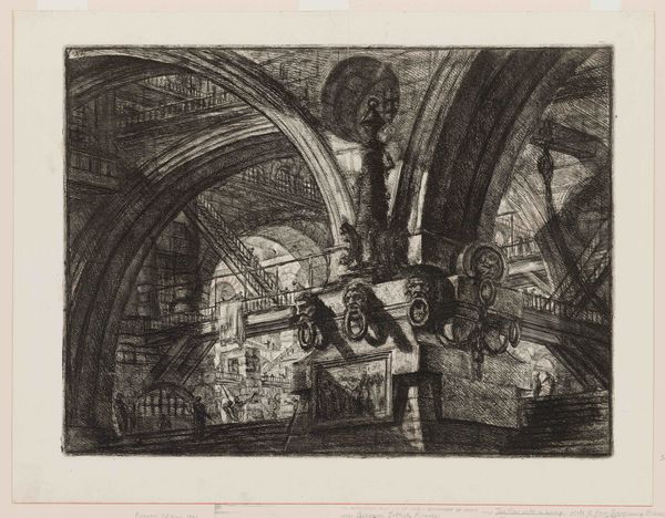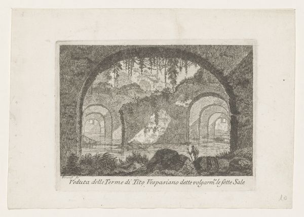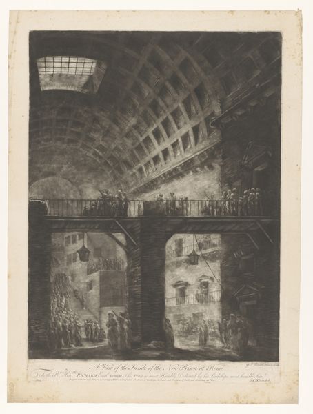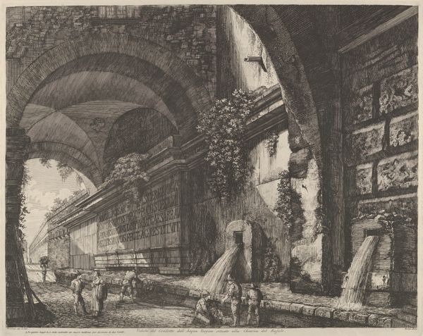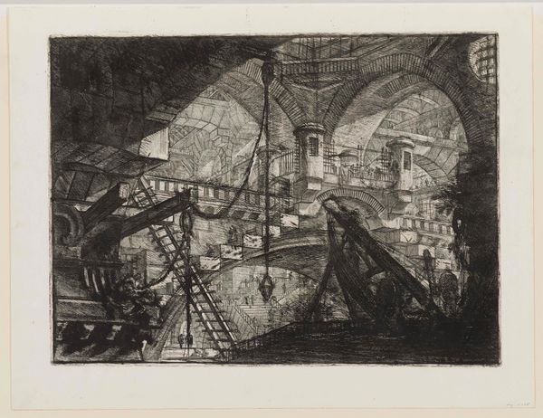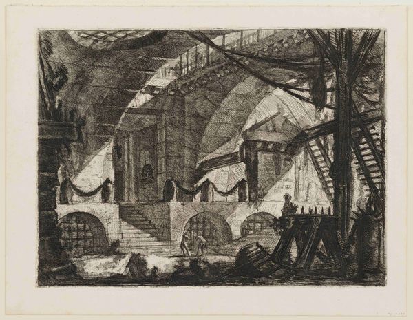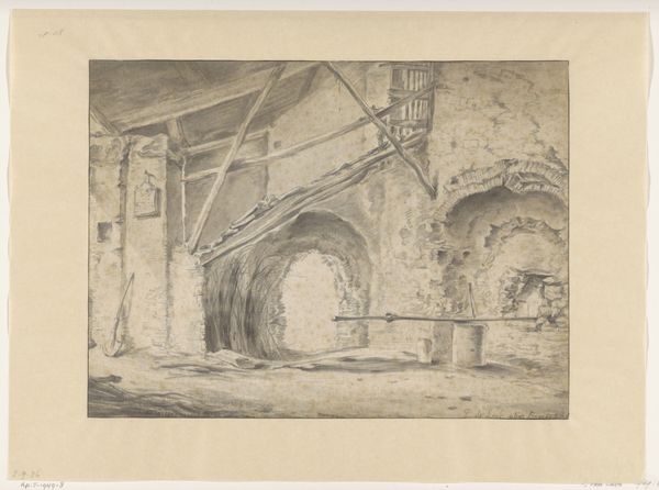 Abel Schlicht created this wash drawing, "Underground Prison," in the late 18th or early 19th century. The eye is immediately drawn into a somber, cavernous space, evoked through stark contrasts of light and shadow. The architecture dominates, with massive arches and stone structures rendered in muted tones, creating a palpable sense of confinement. The composition employs a rigorous geometry, yet the uneven textures of the stone and the fluid washes soften its severity. This interplay creates a tension, a visual paradox. The artwork destabilizes established meanings by evoking both the rational order of architectural design and the chaotic, irrational emotions associated with imprisonment. The subtle semiotic details – the distant figures in a boat, the hanging lantern – hint at stories and histories, yet these are subsumed by the overwhelming sense of enclosure. Ultimately, the drawing challenges us to look beyond surface representation. Schlicht uses the formal elements of light and shadow to evoke not just a place, but a state of mind, reflecting broader artistic and philosophical concerns about freedom, confinement, and the human condition.