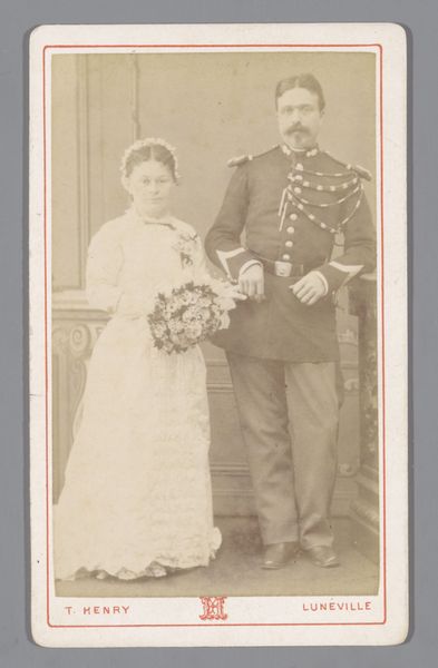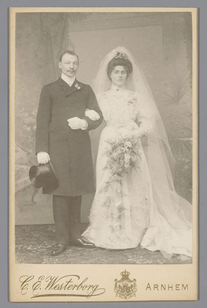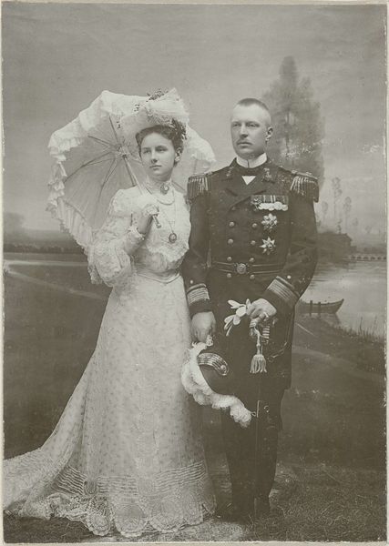 Curator: Here we have a photographic portrait dating back to 1901. The photograph features Queen Wilhelmina alongside Prince Hendrik, created by Ferdinand Robert Ebner. Editor: The stark formality immediately strikes me. There’s a somber mood, heightened by the sepia tones and the subjects' rigid poses. It feels very controlled, very posed. Curator: Well, consider the political climate and social expectations of the time. The Royal family's image was meticulously crafted, so control was paramount. This photograph was instrumental in constructing the Royal Family’s identity. It captures Wilhelmina early in her reign alongside her husband and strategically conveys an image of stability and power. The rigid pose can be seen as representing power through formality. Editor: Absolutely, but I wonder how Wilhelmina herself experienced that pressure to conform. The parasol she’s holding – is it merely an accessory, or a shield? I’m always looking for signs of resistance, subversion, even unconscious rebellion. It makes you wonder whether the prince standing tall with medals could understand what a challenge his wife faced as a woman, as the reigning monarch, as the symbol of power. How might those systems intersect and collide within this single image? Curator: Indeed, the semiotics of royal portraiture offer fascinating avenues for interpretation, revealing societal ideals and power dynamics. Consider how the circulation of images such as this helped to define Dutch national identity and strengthen the monarchy's public image. This was, in its time, a tool of nation building. Editor: Absolutely, and thinking about audiences then and now, does the performative nature of such portraits ever risk undermining the credibility they aim to establish? The context is different for viewers now and what was supposed to establish power in 1901 could signal stuffiness, perhaps? Curator: Perhaps. These royal portraits often serve as valuable primary sources, offering unique insights into a pivotal era of societal transformation. What strikes me most is the photograph’s power, whether positive or negative, in establishing and reflecting national values. Editor: And for me, the quiet resistance to that power subtly etched in the eyes of its subjects. Both, I think, shape how we interpret and question history through art.