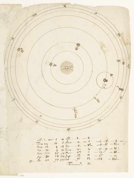 Jan Brandes made this drawing of the solar system, according to Leonhard Euler, in the late 18th century. It's made with ink on paper, using techniques of drafting and calligraphy. The drawing reflects the worldview of its time, but also reveals the labor involved in producing knowledge. Each line, each annotation, is carefully rendered by hand, demanding skill, time, and patience. The act of copying and illustrating Euler's theories embodies a form of craftsmanship, where understanding is demonstrated through meticulous reproduction. Consider the social context: Brandes, an artist working during the Enlightenment, engages with scientific ideas, translating them into a visual format. The drawing becomes a testament to the era's pursuit of knowledge, blending artistic skill with scientific inquiry. It challenges the hierarchy between art and craft, showing how both contribute to disseminating and interpreting complex concepts. By appreciating the materiality and making of this drawing, we recognize the interconnectedness of art, science, and society.