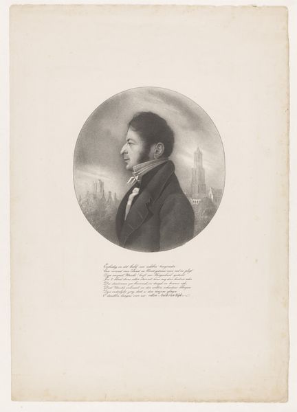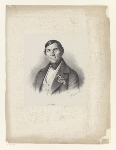 Editor: So, this is "Portret van Antoine-Jean Gros," created by Bernard Romain Julien, sometime between 1835 and 1838. It's a pencil and engraving print. It's striking how he averts his gaze, lost in thought. What significance do you see in his pose? Curator: It's compelling, isn't it? The averted gaze can symbolize introspection, yes, but let's also consider the Romantic era in which this print was created. Consider how clothing of the time carried meanings. Is he Napoleon looking over the battlegrounds or, as suggested, just contemplating artistic endeavor? Editor: That's interesting. Romanticism often explores the individual versus society. The inscription says his name. Is that another symbol? Curator: The inscription of "Gros" serves a purpose, acting as a kind of signifier. This work memorializes Antoine-Jean Gros and alludes to his standing. The engraver immortalizes the portrayed within specific cultural expectations, hinting at the burden and grandeur of artistic legacy. What echoes of past representations do you observe? Editor: The detailed rendering of his face certainly lends him a serious tone, a man dedicated to his profession. It is similar to official portraiture of powerful figures. I hadn’t really thought of it as a memorial before. Curator: Yes, and even the choice of rendering him in print carries weight. The image becomes reproducible, disseminating his likeness and, by extension, his artistic influence. Reproductions alter the Aura, Walter Benjamin would say. Don't you find it telling how even in supposed likeness we encounter cultural codes of fame and remembrance? Editor: I see your point. It's not just a picture, but an active carrier of cultural memory and a claim to historical importance. It has certainly been enlightening to really explore the visual culture and artistic codes in it.