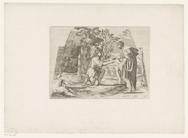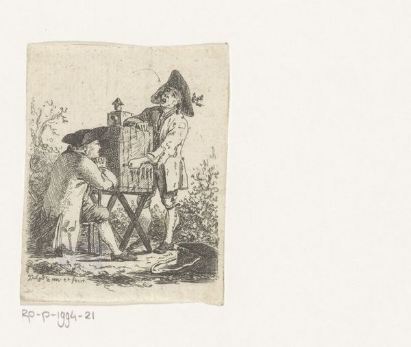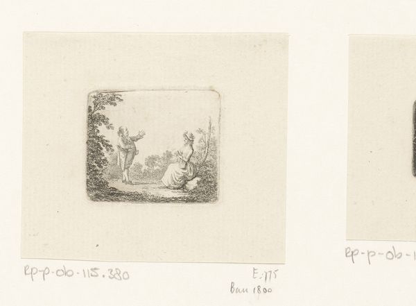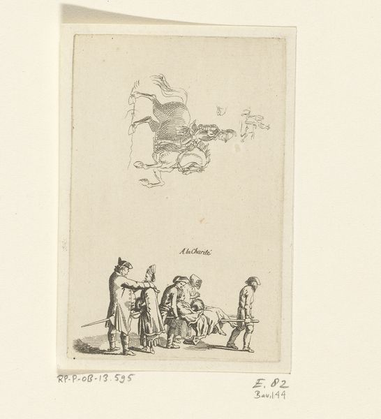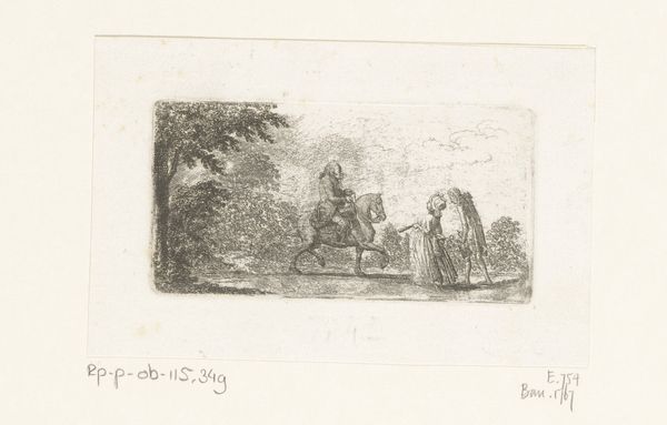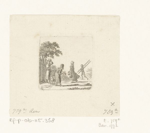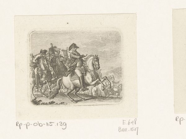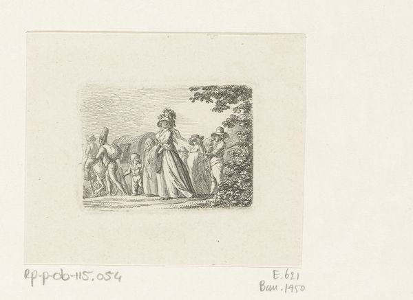Curator: Welcome. Before us is Daniel Nikolaus Chodowiecki’s “Uittocht van het Turkse leger,” an engraving dating to 1790. It’s currently part of the Rijksmuseum collection. Editor: Immediately, I'm struck by the starkness of the line work. The almost clinical precision used to portray a rather grand historical subject feels…unexpected. The stark, almost ghostly pallor seems to subdue the figures. Curator: Indeed. Chodowiecki’s rigorous linearity defines his oeuvre. Note how each figure and animal are delineated with incredible economy of line, creating a scene both precise and somewhat distanced from emotionality. But to look at this print is to acknowledge the rise of enlightened historicism, and that art was very involved in representing military culture. Editor: True, the historical context is important. I do think this stylistic approach impacts how we read the content, though. It emphasizes the supposed clarity and objectivity in portraying history—a kind of dispassionate recording of events. However, the actual impact feels quite artificial. I find this approach a fascinating, almost proto-cinematic method to portraying war. Curator: I agree to some extent. But I feel that the overall compositional balance suggests it aims at something other than simple documentary effect. Observe the delicate interplay of dark and light, guiding our eye to appreciate its symmetrical order within this historical setting. And this piece surely spoke to Europe’s interest in the Ottoman Empire. It would speak to narratives of exotic otherness. Editor: Perhaps it attempts to do both. Chodowiecki seems caught between a desire for objective recording and romantic stylization. That contrast itself can speak volumes about that era’s perception of history. Also, notice that it's not really about battle: its more about procession, ritual, power... less about carnage. This reveals something too. Curator: The precision with which each figure is rendered makes a big impact. So considered. Editor: A fascinating artifact, prompting so much reflection on its method and meaning! Curator: It offers more nuance the longer we look!
