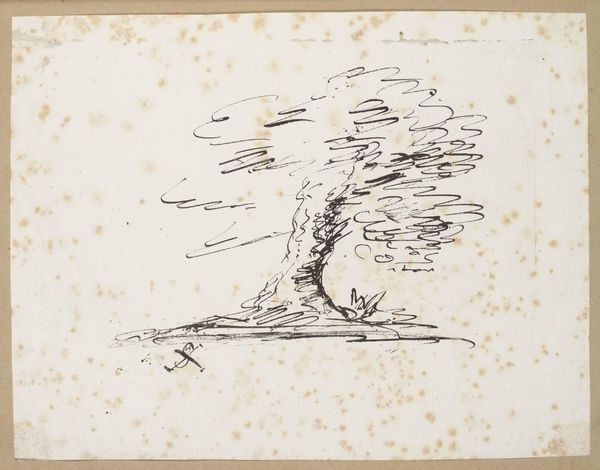Editor: This is Leo Gestel’s "Landschap met een vliegende zeemeeuw," or "Landscape with a Flying Seagull," made sometime between 1891 and 1941 using ink on paper. The stark black and white has a striking, almost graphic quality. What's most interesting to you about this drawing? Curator: I'm drawn to the interplay between abstraction and representation. Gestel's use of ink to depict this landscape is far from photorealistic. Consider the social and economic factors here. Ink was a relatively accessible and mass-produced material during this period, shifting away from precious paints. What does that suggest to you about the intended audience or purpose of this piece? Editor: Possibly something more democratic, less focused on appealing to wealthy patrons? Like it’s made for a wider consumption? Curator: Precisely. And note the deliberate use of line and form to evoke the landscape. The thick outlines almost flatten the image, negating depth. Gestel is highlighting the materiality of the drawing itself, forcing us to consider the labor and process of creation. Is it more concerned with 'being' or 'representing' the landscape? Editor: I see what you mean. It’s like he’s drawing attention to the very act of making the image. Curator: Exactly. By simplifying and abstracting, Gestel democratizes not just the medium but also the artistic experience, inviting the viewer to participate in constructing the landscape. Also notice the serial aspect, which further challenges the artwork’s auratic nature, bringing art closer to productivism. Does that resonate with you? Editor: Absolutely. I hadn't considered the broader context of materials and production influencing the artwork's meaning in that way. Curator: Thinking about materials, production, and consumption opens a lot of interesting perspectives. Editor: I’ll definitely keep this in mind when looking at other works of art!