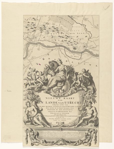 Curator: What we have here is an engraving called "Putto en engel bij cartouche met dubbele adelaar" by an anonymous artist, created sometime between 1720 and 1740. It seems to be a print, showcasing a double-headed eagle and cherubic figures flanking a cartouche filled with text. It almost feels like a propaganda piece to me, especially with that stern-looking eagle. What’s your first impression? Editor: I’m struck by how much is going on. The combination of these allegorical figures and almost topographical map behind them creates this strange sense of reality and symbolism mashed together. How do you interpret this work within its historical context? Curator: Well, consider the period. This is post-Thirty Years' War, a time when the Holy Roman Empire, which this image references directly in its cartouche, was trying to reassert itself amidst fragmented territories. What do you notice about that double-headed eagle, and its positioning above the text? Editor: It's very prominent and assertive, looking like it’s protecting the text below, almost as though it’s guarding some crucial information or pronouncement. The Holy Roman Empire…Was this trying to unify different regions through visual rhetoric? Curator: Precisely! The text lists different regions or "circles" within the Empire, implying a desired unity and order. Those putti, or cherubs, common in Baroque art, often symbolize divine endorsement. And, see how the weaponry and the barrel are placed; what story do they narrate? Editor: Ah, that the might makes right? Maybe they symbolize both protection and the potential for subjugation if those regions stepped out of line? It's definitely less innocent now. Curator: Exactly. This piece becomes a fascinating artifact reflecting the Empire's aspirations and anxieties. It is definitely intended to create an idea of power. What do you think about how something that looks so artistic on the surface can speak volumes about power dynamics and control? Editor: It's a reminder that art is rarely created in a vacuum. Looking beyond aesthetics unveils how deeply intertwined art, politics, and social structures really are. Curator: Absolutely, and the more we investigate art within its historical, social and political landscapes, the better we understand it!