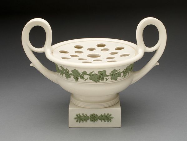 This jug was likely made at the Staffordshire Potteries, using a process called Jasperware. The jug is made from a fine-grained, unglazed stoneware, colored a muted green. What makes Jasperware distinct are the applied classical motifs. These were made separately in molds and then carefully applied to the surface of the jug before firing. The contrast between the green body and the white reliefs gives the jug a crisp, refined appearance. This sophisticated, neoclassical style gained popularity in the late 18th and early 19th centuries, reflecting a broader interest in classical art and design. The jug shows the division of labor which underpinned Staffordshire’s success. Some workers would have been responsible for mixing the clay, others for molding the bodies, and others for the painstaking work of applying the sprigged decoration. By carefully considering these labor and production processes, we can fully understand this jug's place in the history of both art and industry.