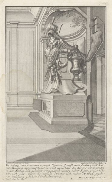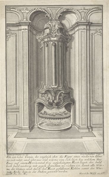 Curator: This engraving, entitled "Doopvont," dating from after 1724, is attributed to Johann Matthias Steudlin and is part of the Rijksmuseum collection. Editor: My initial reaction is one of formality, and coolness. It looks like the stage has been set but the play hasn’t started yet. What do you think about the role of sacred space here? Curator: Well, from an art historical perspective, the engraving documents the elaborate design of a baptismal font within a church setting, it gives insight into 18th-century liturgical design and its intended function within religious practices and wider religious ideology. The image itself reinforces established hierarchical social systems in post-reformation churches. Editor: It also makes me think about the role of spectacle in faith. It’s baroque but feels stripped-down, like the bare bones of opulent displays, meant to enforce faith through a combination of awe and architectural authority, wouldn’t you say? How would such art influence gender or class during worship in these contexts? Curator: Yes, these highly ornamental architectural prints could have reinforced prevailing gender roles within society and encouraged conformity to prescribed societal roles in baroque society. Spaces, imagery and sacred events all were subject to strict regulations. Editor: It feels sterile. Can we consider how the act of portraying a site designed for purification using these media affect our understanding of it, particularly in terms of identity or belonging? It’s the tension between community and order—what and whom these structures exclude and include in the sacred act. Curator: Precisely! How is inclusion and exclusion demonstrated or emphasized, in addition to, say, performance? This image is very much indicative of baroque styles and ideologies in general, its role in both maintaining power structures and simultaneously shaping or being reshaped, by them is of course, up for debate. Editor: Thank you, this has really brought the image to life for me, making it feel less rigid and more alive as a document of past practices that impact today. Curator: Indeed, examining art through various contextual lenses can enrich our understanding, bridging historical design and contemporary reflections on faith and society.