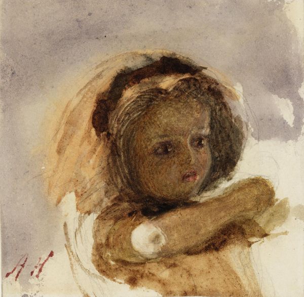 Editor: Here we have Olga Boznanska's "Portrait Sketch of a Young Girl" from 1894, done with gouache. I find it so wonderfully melancholic; the muted tones and the girl’s pose give such a wistful impression. What catches your eye in this piece? Curator: That "wonderfully melancholic" note is key. I think Boznanska has captured that particular teenage ennui brilliantly. Look at the soft, blurred edges. It's like a half-remembered dream. Does that wistfulness also tie into what's included and what's omitted? Editor: In what way? Curator: Well, she’s holding what seems to be a small pipe or brush; beside her are vibrant flowers, all indicators of artistic life. Yet they don't seem to animate her at all. Do you find she seems engaged? It’s a life perhaps prescribed for her. Editor: I hadn't considered that at all, it adds a whole new dimension! I just thought it was about a quiet, introspective moment. Curator: Exactly! It shows how powerful suggestion can be, that painterly style invites interpretation. What do you make of the flowers? Editor: Well, they bring some lightness to the scene, a pop of color amongst all those drab shades. Maybe they’re a symbol of hope or beauty? Curator: Perhaps, but don’t forget their transience. Like youth, they are beautiful but fleeting. A good counterpoint to her enduring image as captured here. That’s what great art can do; it leaves you pondering. Editor: I will certainly ponder on that; there’s so much more than meets the eye, isn’t there? I really learned a lot.
