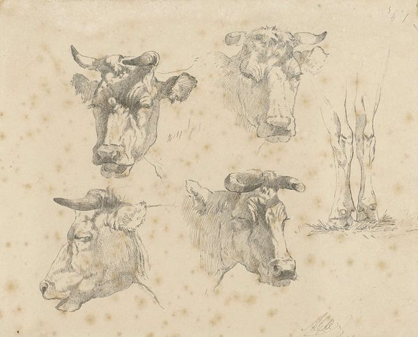 Curator: This is "Two Studies of a Cow and Three of a Horse" by Gerard Bilders, made with pencil between 1848 and 1865. It’s currently held in the Rijksmuseum collection. Editor: There's a tentative, almost fleeting quality to these sketches. They capture the essence of the animals with such delicate, light pencil strokes. It's more about suggestion than precise depiction, isn't it? Curator: Absolutely. Bilders was deeply engaged with the Realist movement, seeking truth in everyday subjects. These sketches weren't meant as finished pieces, but rather as studies – explorations of form and light to prepare for larger works, probably landscapes with farm animals. Remember that mid-19th century Dutch art valued a very naturalistic view of the landscape and the rural sphere as one deeply connected to the nation itself. Editor: And what symbols were traditionally associated with these animals? The cow evokes notions of abundance, nourishment and the maternal, whilst the horse always represents power, freedom, sometimes virility and untamed natural energy. Bilders would've known these connotations as a standard language, as well as a rural setting, wouldn't he? Curator: Undoubtedly. Animals are laden with symbolic weight in the history of art. These aren’t simply livestock; they represent aspects of the Dutch landscape ideal, which itself carried immense social and political weight during the 19th century, reflecting back to an idealised golden age. Artists had a significant part to play in propagating such ideas. Editor: Looking closely, there’s an interesting contrast in how Bilders treats each animal. The cows feel softer, almost more vulnerable. The horses have a palpable tension in their posture, which is striking even in these incomplete studies. It gives me the impression of the pastoral world as one where brute labor also resides, never truly picturesque, but close to ordinary toil. Curator: That contrast speaks volumes about the complex realities of rural life that the Realists tried to convey. He acknowledges this world in its full complexity. Editor: Yes, these animals aren’t just figures in a landscape, but potent cultural symbols and very tactile beings on the page as well. It enriches one's encounter to reflect on that. Curator: Precisely. The study is not an attempt to simply represent a reality, but a concentrated examination of core political and symbolic values.
