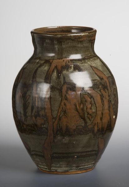 Editor: This is Michel Cardew's "Lidded Tobacco Jar," held at the Tate. It feels quite grounded and earthy. What stands out to you formally? Curator: Note how the artist employs horizontal bands to visually anchor the rounded form of the jar. The glaze pools and thins, creating a dynamic interplay of light and shadow that enlivens the surface. Do you observe how this affects your perception? Editor: I see! The variations in the glaze do add depth and visual interest. The abstract motifs also seem to disrupt the static nature of the bands. Curator: Precisely. The curves of the decorative elements contrast with the rigidity of the lines, creating a formal tension. A sophisticated dialogue between form and surface. I'm glad you noticed that. Editor: Thank you. I had not considered that before.