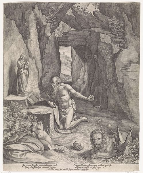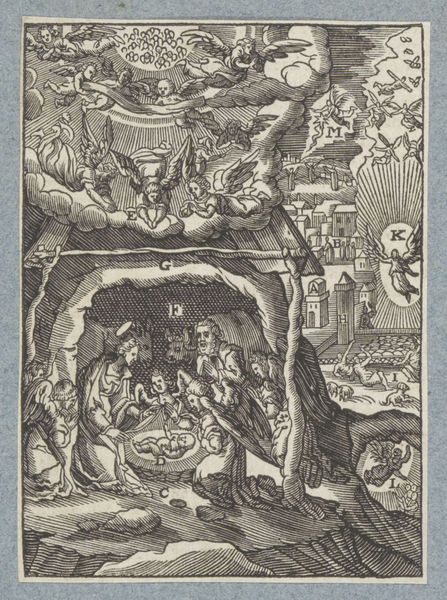 Curator: Here we have Wenceslaus Hollar's "Resurrection," a piece made between 1644 and 1652, currently residing at the Metropolitan Museum of Art. It appears to be an engraving using ink. It looks so busy, doesn't it? Editor: It certainly does. I’m immediately struck by the sharp contrast between the floating figure, presumably Christ, and the much darker, earth-bound scene below. What structural elements define its message most clearly? Curator: Excellent observation. Focusing on form, one notices how Hollar uses the contrast in light and shadow to divide the composition into distinct registers: spiritual and corporeal. Notice how the diagonal lines direct the viewer's eye upward from the feasting soldiers towards the ethereal Christ, effectively visualizing a hierarchy. Editor: The figures in the lower portion seem almost caricatured in their indulgence. Is this exaggeration intentional, do you think? Curator: It appears so. Through their posture and grouping, the earthly soldiers mirror the form of Christ floating on a cloud in a direct comparison of their nature. Do you see how the formal elements underscore the narrative’s implied critique of worldly pleasures? Editor: Yes, I do! So, the way the artist has structured the composition, light, and the poses of figures all contribute to the theological argument. I hadn’t considered how powerfully form can serve narrative! Curator: Precisely. By engaging with this structural and visual approach, we glean insight that context alone might obscure. It allows us to actively witness the underlying conceptual and theoretical framing. Editor: Fascinating. It highlights how technical and compositional choices serve the artist’s intentions. It adds another layer of meaning to simply interpreting narrative. Curator: I agree; analyzing those intrinsic formal elements unlocks such potential depth.